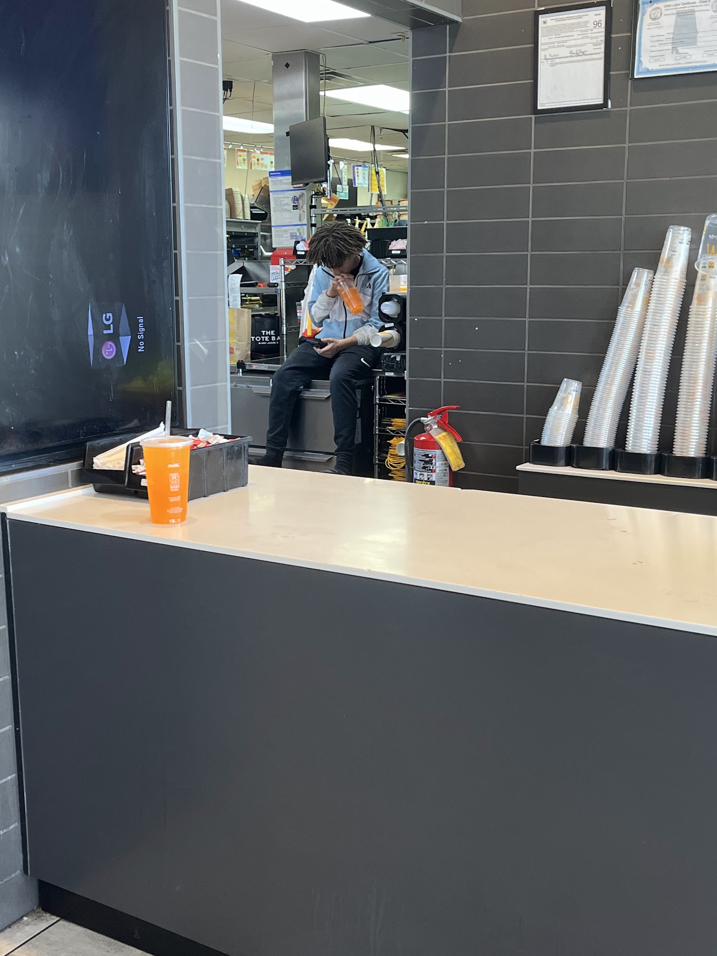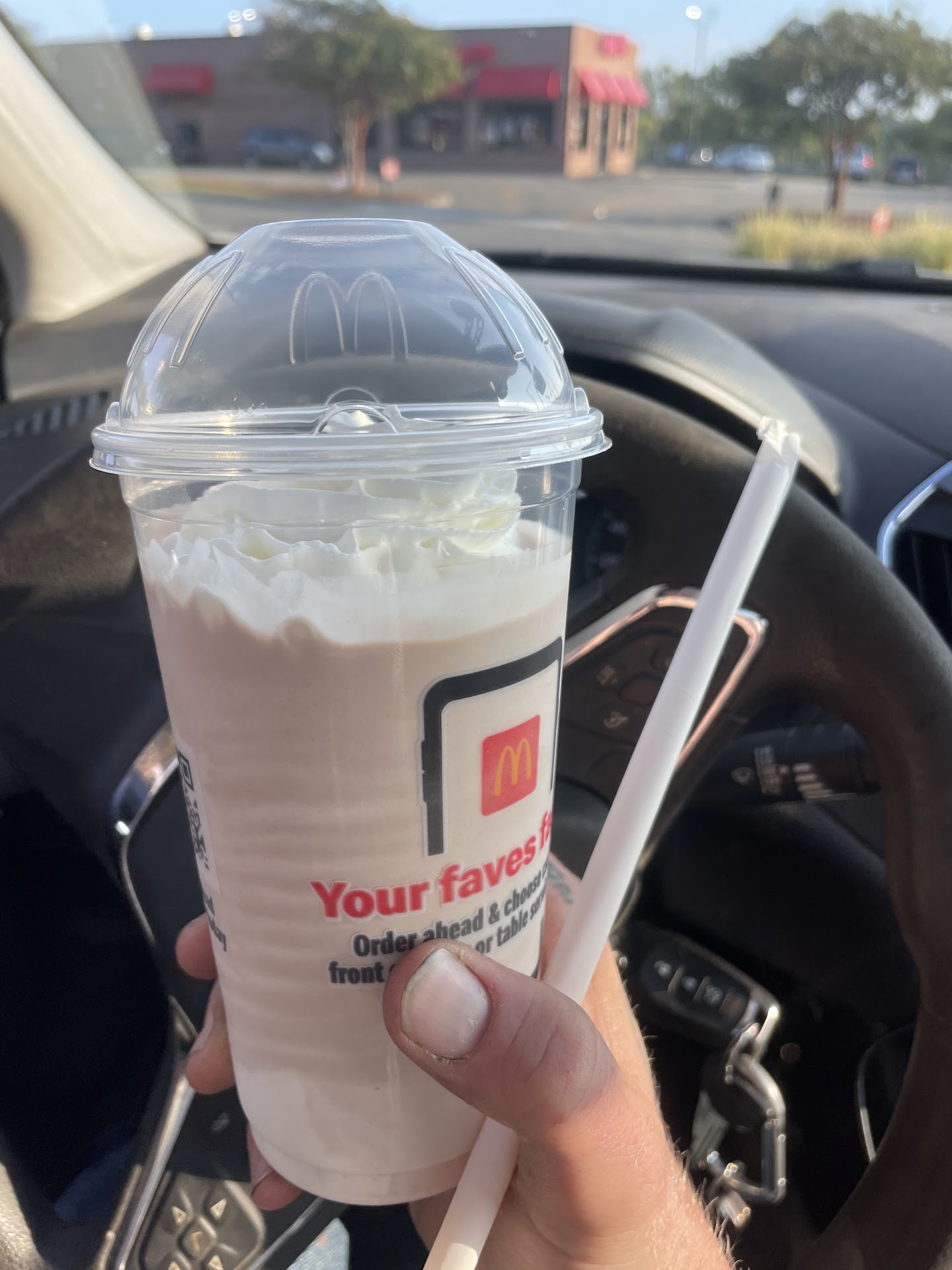 After I get the condiments we patiently sit and wait at the drive-thru window. The girl (employee) working the window, one of the 3 (employees) bc it took 3 to complete the order, is standing there just smiling back at us...and we tell her we are waiting on our hot fudge Sundae. OMG. She looks at us all sitting in the car, nobody is holding (hiding) a sundae, turns around asking the other employees if they gave us the sundae, No, No, Nobody did.