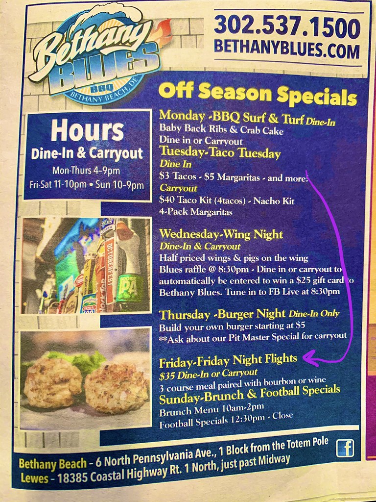 Please note - though Bethany Blues has great in-house delivery - for some reason they won't deliver the Flights with the alcohol. Even though Door Dash, does. If you want the drink special - you gotta go pick it up!