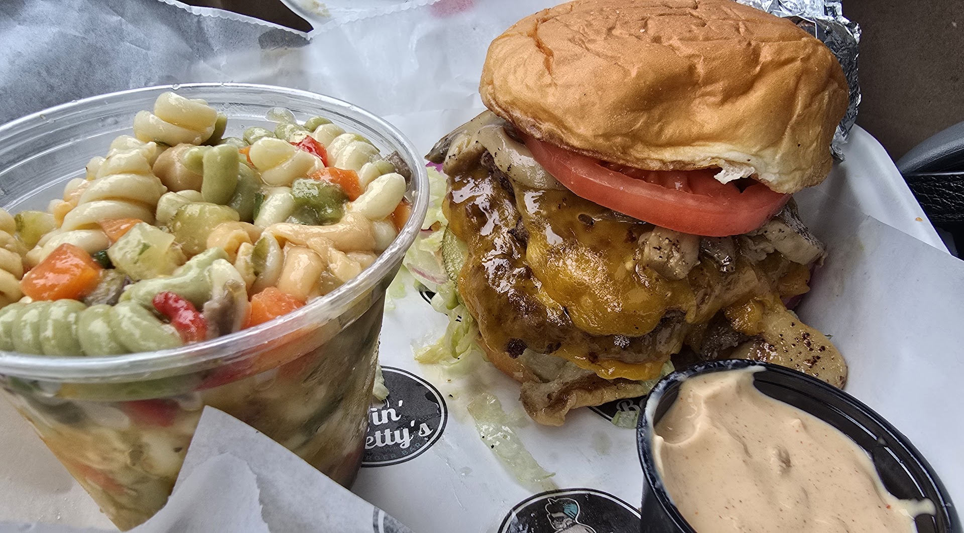 I got the Bettie burger and it was really good. I liked it. My friend got the the jam, bacon burger, his was overcooked. He didn’t think the pasta salad was anything to write home about either. I subbed the french fries and I’m glad I did. I really liked them. We just got a couple of regular sodas because it’s too hot to drink liquor, but I must complement them on the full range of beers, wines, and liquors that they offered. I appreciated how they came by and asked how everything was and I told my friend he should’ve mentioned that the burger was overcooked, but he decided not to that was on him. Only three stars because the ask for tip in advance annoyed me. What if the food and service was bad? Ask for...