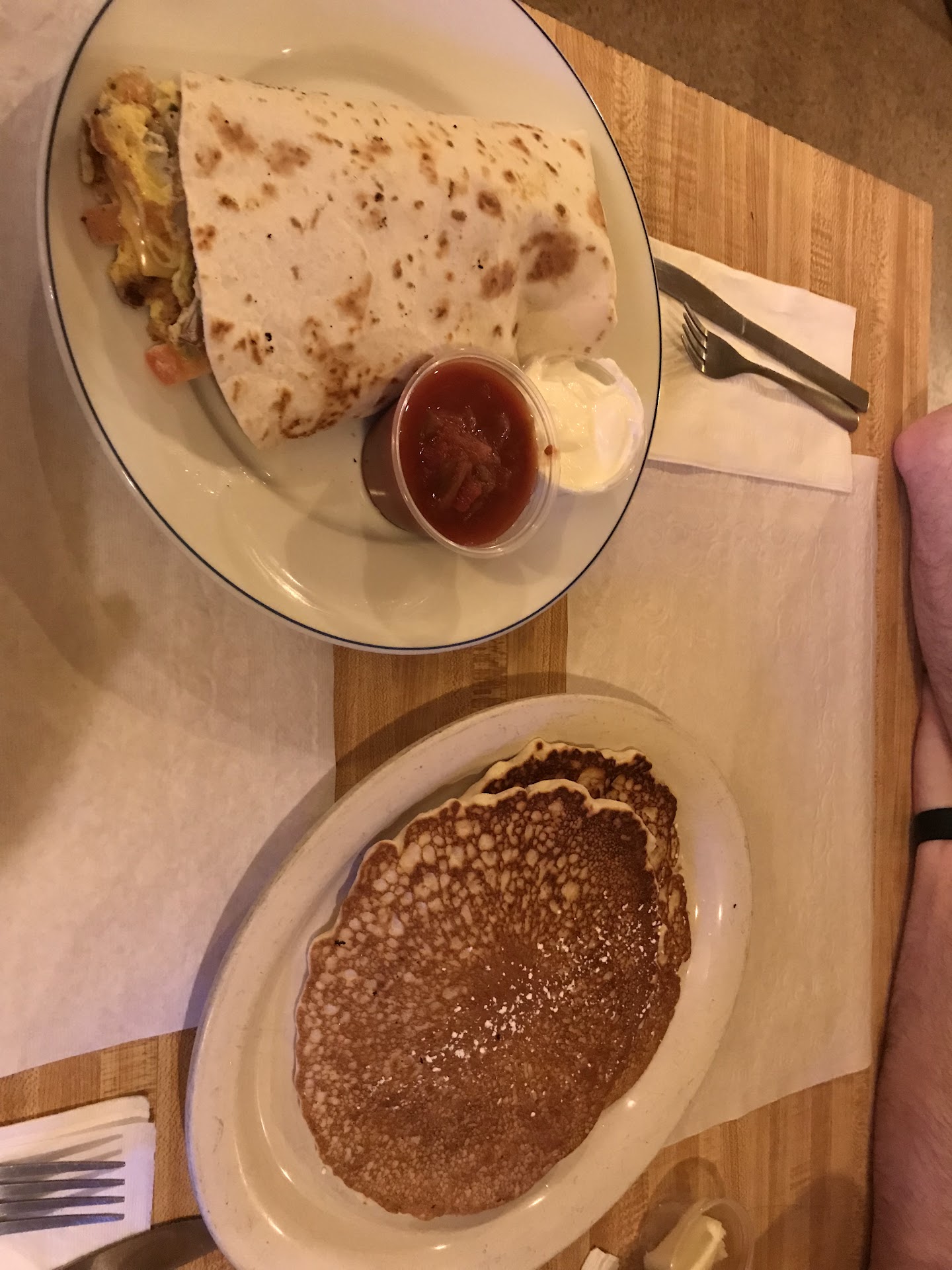 The pancakes cover the plate and were only $2 each ($2.50 for some of the mix-ins - I went with pecans and there were some in every bite).
