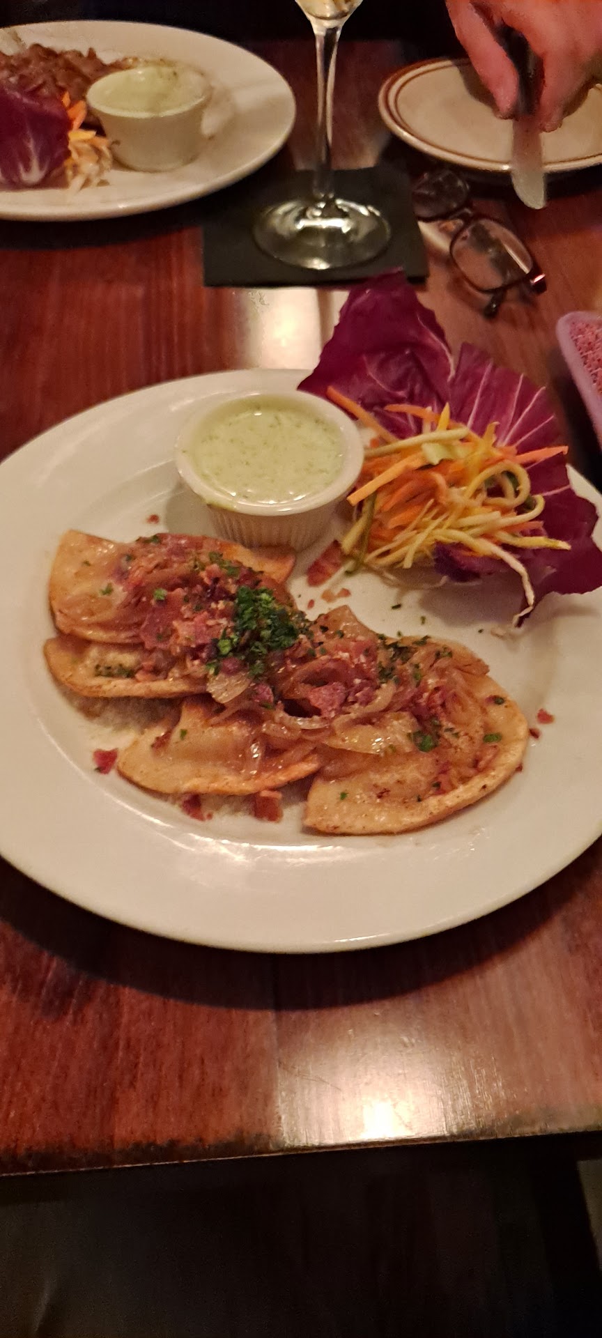 Just a snippet of what our pallets got to experience from their evolving menu… •Pierogis with caramelized shallots, crumbled bacon, gorgonzola, and pesto sour cream. PERSONAL FAV! •Black Nights - Sautéed artichoke hearts over spinach with horseradish aioli. • Bacon-wrapped jumbo shrimp with maple-bourbon butter and a side of tasty capellini. •”THE” Buffalo-Pops! •Mussels in a wine cream sauce DELICIOUS. •By far THE BEST french onion soup you’ll ever have. I’ve never had this version. Baked apple topped with Gruyère cheese served over a full of onion bowl...