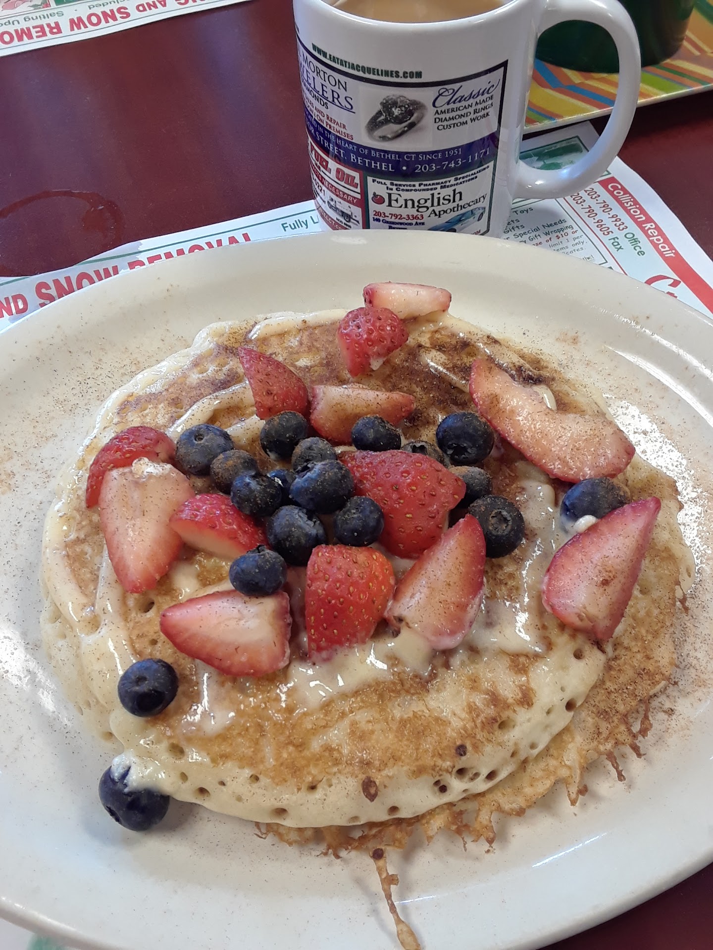 Read moreAte here this morning with my boyfriend and two local friends. Had been a bunch of times and always had excellent experiences all around: delicious food that corresponds with fair prices and friendly staff. I typically got one of the specials or French toast. Can't tell you why I had never tried the pancakes but I'm glad I did today. I had the cinnamon swirl pancakes topped with blueberries and strawberries and the pancakes were amazing! The portion was just right and the pancakes didn't leave me feeling overwhelmingly full; instead I was simply satisfied. My boyfriend had the cajun chicken omelette which I would also recommend if you're looking for something...