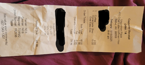 This is one of the BEST pizza places in Alaska. Also, the best spot in Bethel, in my opinion. The staff is always super friendly, and they are happy to bring my orders right over next door where I work. They do an amazing chicken bacon ranch pizza, and their breakfast pizzas are awesome too. These guys definitely earn their tips. The owner is a super nice guy, as well. I had the privilege of meeting him on the flight over to Bethel. Also, it's one of two places in Bethel that serves alcohol, so if you want a nice beer at the bar, I'd highly recommend them.