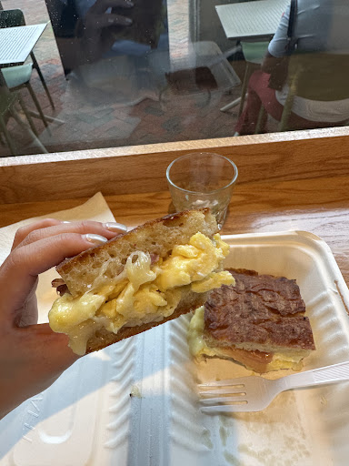 Although I originally didn’t plan on ordering coffee (I wanted to nap on the bus), I couldn’t resist trying their espresso. Served in a glass cup, it was excellent—smooth with bright citrus notes. I also ordered the scrambled egg and cheese on focaccia, added prosciutto, and loved how unique and delicious it was. I spent ~$17 for the espresso and the focaccia breakfast.