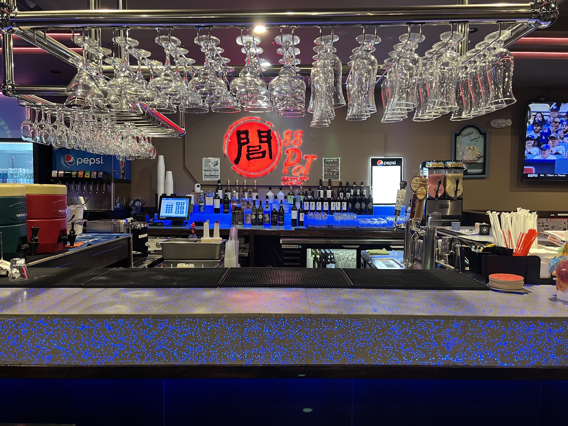 Modern, stylish, and packed with giant screens playing sports (because nothing says âletâs eat moreâ like watching other people run around). The blue neon lighting gives the place a cool, futuristic feelâlike youâre about to enter an elite food-eating tournament.