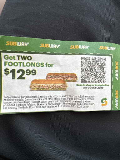 Read morewent to this location to redeem the coupons i got in the mail, the young guy helping wasn’t sure if it was applicable or not but he read the coupon and said that the sandwiches listed below aren’t part of the deal so as long as i get anything but those we’re good to go. we went ahead and ordered, they made our sandwiches we made our way to the cashier and the indian guy (owner, manager or district manager idk) said that the same coupon CANNOT be applied bc i got a philly which is a sandwich listed. i showed him the coupon and told him that he was wrong and that it wasn’t one of the ones listed. he told me “it doesn’t need to say it on the coupon, i’m the boss and i’m telling you it’s not part of the deal” so instead of arguing or walking out or causing a scene. i paid for my two foot longs and headed out. the sandwiches were not only skimpy like chipotle but were messed up bc he had an attitude while putting the in the bag and one of them is slightly squished with a hand print. so my message would be to avoid this subway and just go to a different one. that guy was worked up over a coupon and i wasn’t even arguing or giving attitude back. here’s the coupon to show you guys it...