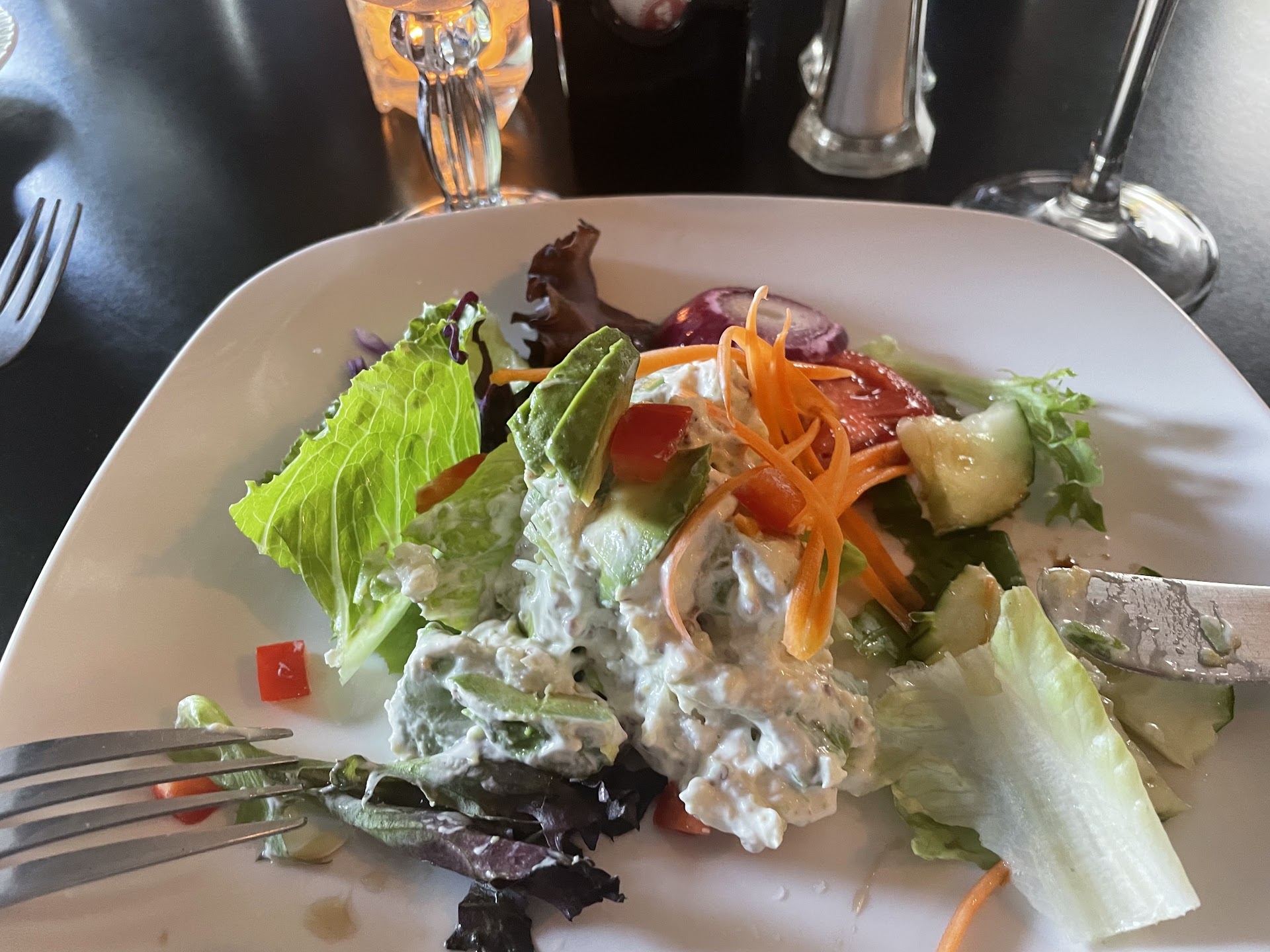 My husband and I enjoyed dinner at 221 Cafe (BYOB) on 31 May 2025. We shared a crab/avocado starter. Husband ordered baked chicken stuffed with goat cheese/ham/swiss, which came with a lovely sauce, potatoes and vegetables. I ordered spicy pad thai basil which was both sweet and only a touch spicy. It came with stir fry vegetables, rice noodles and 5 large shrimp. Both entrees were outstanding. Dinner was followed by a slice of homemade multilayered coconut cake. The bill was less than $100 including tax and tip.
