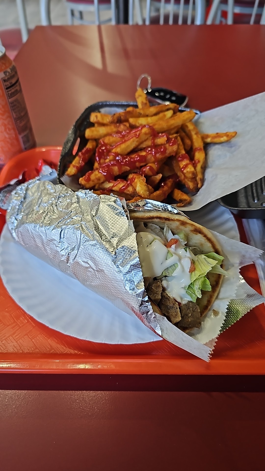 Read moreThis place is the worst of its kind in the area so far. Don't even bother. Go to sizzling bites or flaming hot cause this place sucks. Absolutely ALL rice and the chicken is chopped, dried out and so small it's barely edible or noticeable in the dish at all. I asked for the sauces on the side and I got none. It's clearly on the label they taped to the bag as well and the description said I could pick from any of the sauce combinations with the order. One came with a squirt of flavorless white sauce on top of a pile of so so flavored rice, that was it. The other had nothing on it. Just dried out looking chicken I don't even want to eat honestly. The "salad" is just pieces of lettuce and chunks of tomatoes and maybe a chunk of cucumber but NO DRESSING of any kind. It's dry lol it's a joke. The fries were soggy, oily and normal frozen food fries. Nothing special. Glad it was buy one get one free and yet somehow I still feel ripped off. Will not be back and will tell everyone to go somewhere else 👎🏻 Why I can't post photos of this gross food, I don't know why but I...