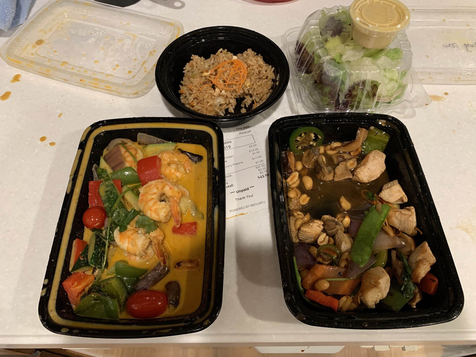 However when we unpacked the order, we found that my container of Red Thai shrimp curry hadn’t been properly sealed and a large amount of sauce had leaked into the bag. The plastic bag saved my car seat from being ruined. My wife ordered Kung pao with fried noodles (which was an extra charge), however they packed fried rice.