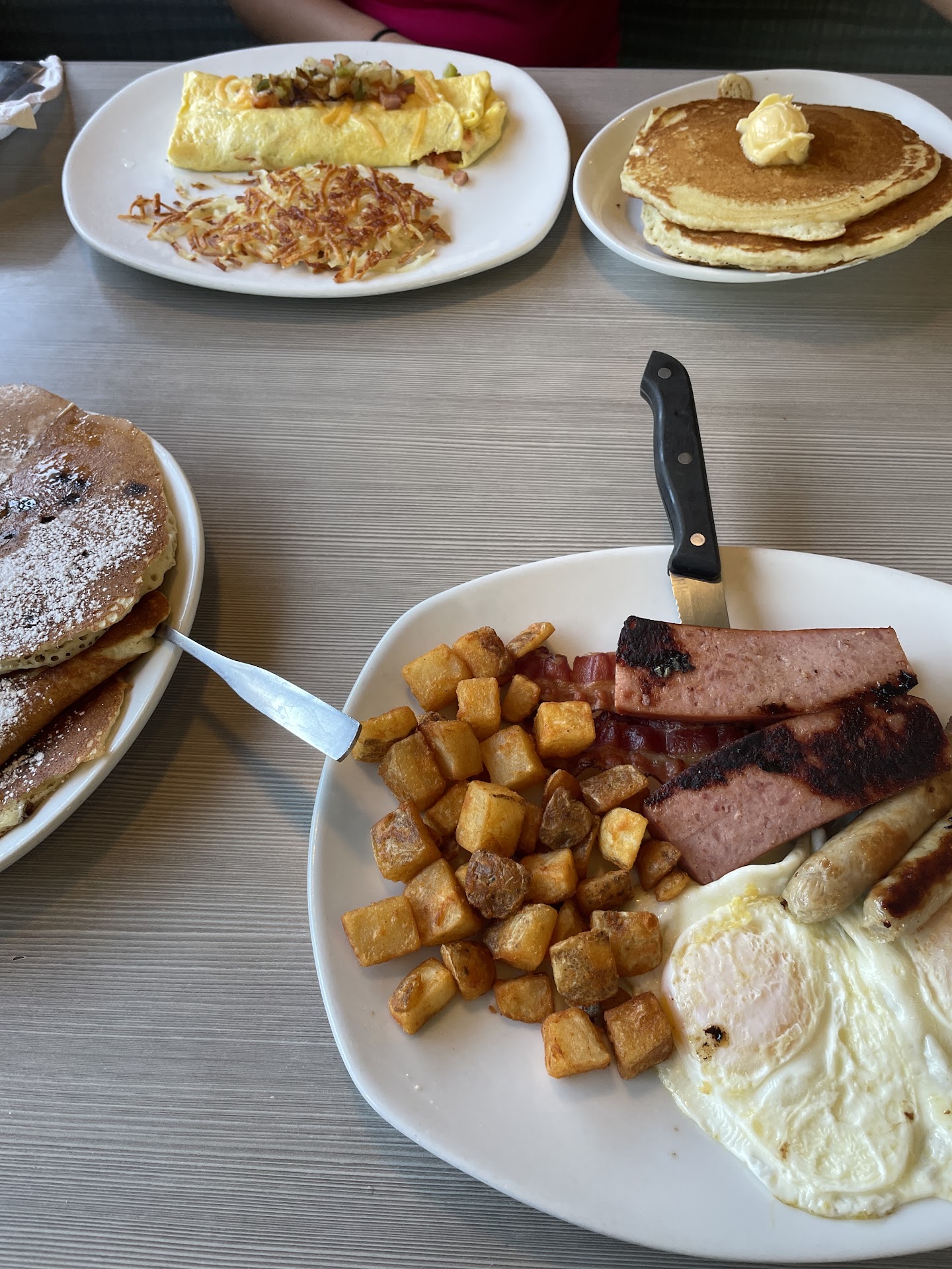 Read moreWhen my kids and I get our table the waitress jes had a dirty rag and wiped the table down with itkeaving the table wet and smelly , I asked one other employees for napkins they told her I needed some so I used some lapwr towels to clean the excess water ,when I did the paper towel was dirty and she finally came with the napkins and asked me if everything was OK I said no that the table was dirty she did apologize and said she cleaned it off that I must've have wiped the seats down too lol .... now we were expecting to wait awhile since it was busy but we ordered our food and got our food in record time! But the eggs were runny on the inside of my scrambled eggs and my hash browns tasted metallic .I was charged $13.00 for 2 scrambled eggs and spoon of brillo pad hash browns and cold sour dough bread ...All in all the best thing they have there is the pancakes which my kids loved ... I really found the place dirty for it being in south...