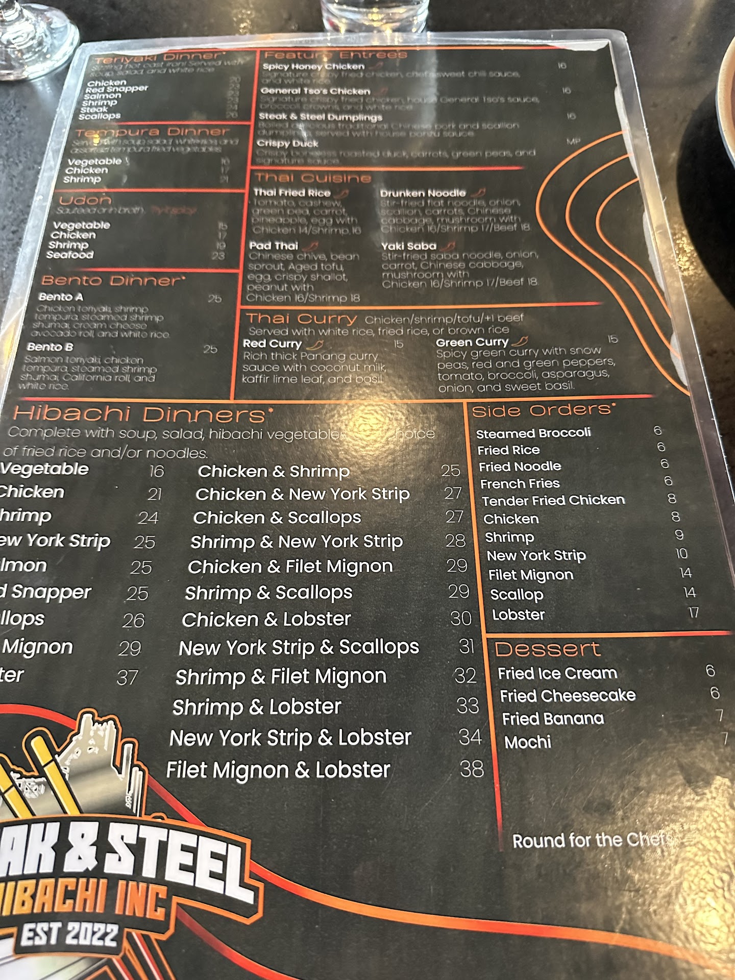 Ā Ā Ā Read moreThis one aināt good!! The food was phenomenal as always!!! Weāve been going there for a few years now. My 15 year old wanted to go there for her birthday and we loved the idea, however this is the first time weāve been so upset about our experience. The table was full and we love that, however the āshowā so to speak was beyond sub-par. Our chef was a trainee, and I certainly do not have an issue with that. Everyone needs to learn their trade, however if our party was just going to have a chef cook the meal with zero personality or zero āshowā, we could have done that at any table. The fact that we shared a space with a younger group of patrons (30 somethingās) was great, however my 15 year old got zero experience & zero attention from it. The other side had a rockin party and Iām sure well deserved but my party of 4 was basically ignored because he was just a trainee. The group of 30 somethingās had a grand old time and my child & her best friend got dinner. Not cool for such a special time in her life. We wanted to make it a big deal for her and we got nothing. I donāt care about the cost, happy to pay, I donāt care about the table, happy to sit with anyone, but the fact that my 15 year old was disappointed by the experience bothers me. I did speak to the young, very young, very, very young āmanagerā & he was about as useless as they come. Again, Iām happy to pay the tab, not looking for any type of discount or freebie, just looking to have my child enjoy her 15th, with her best friend and we got dinner. The gentlemen, was an excellent chef, but the experience pretty much ruined the āflavorā for us. If the restaurant wants to reach out. Iād be happy to discuss our displeasure. Again we love, love, love, Steak & Steel, however this time, they really dropped the ball for us. It may be a while before we come back, and Iām actually...