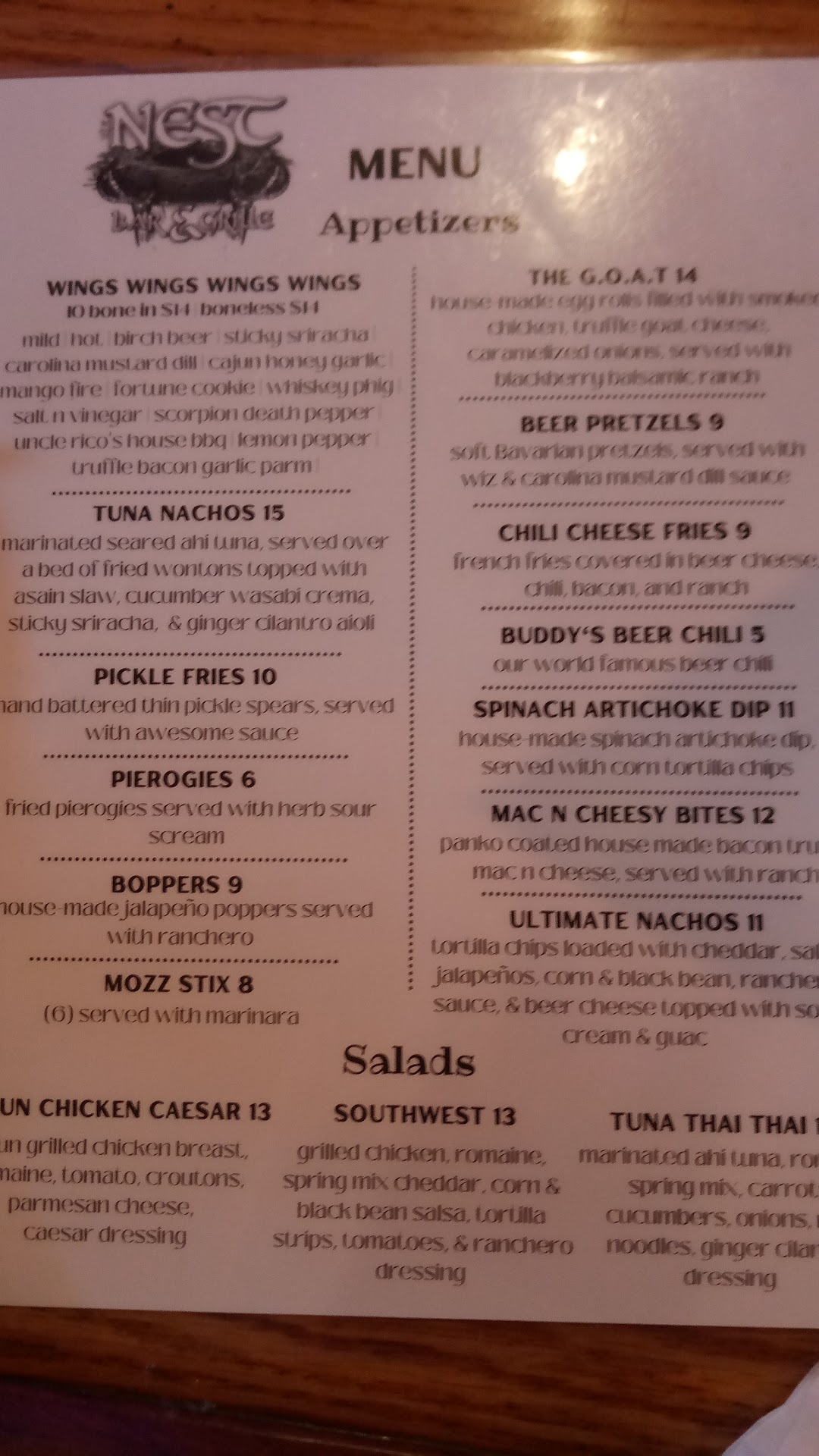 This was our first visit to The Nest. Driving by it you many miss it. The door on the corner looks like any other building as you drive by. Inside you’re met with a long bar with 4 TVs. A narrow aisle between the bar and shelf seating on the other side. Stepping up to your right, there is inside table seating. Passing through the aisle, you met with a nice outdoor bar and uncovered table seating with 3 more TVs. I heard there was an upstairs but didn’t investigate. It soon became clear why it’s called the Nest. Eagles and their fans seem to inhabit the place. Actually seemed any Philadelphia sports team fans were welcome. The menu has an excellent selection of mixed drinks. Several taps had the standard national brand beers and a couple of craft beers. The craft beers seemed to be an afterthought. The menu listed “Conshohocken Brewery IPA”. I asked which IPA as CB has multiple IPAs. After a quick investigation, the answer came back: no one was sure. (My guess after ordering it and tasting it, it was their Type A IPA.) The menu includes pub munchies and “basket” food. You’re not coming here for the food. Other kinks they need to work out - no one knew the guest Wi-Fi password and cell reception at the back bar is not great.