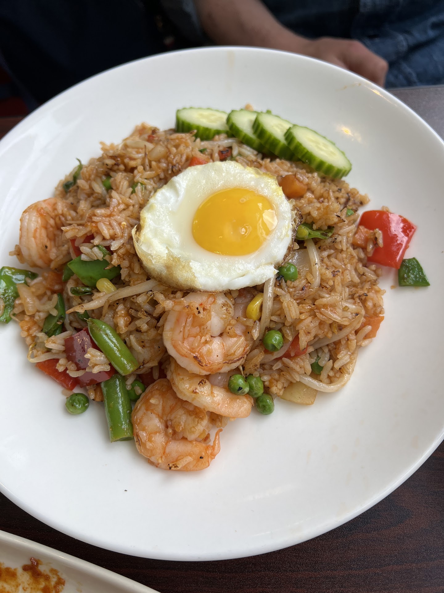 For the appetizer we ordered gochujung tofu. Great taste and not too spicy. All of us could share it. We ordered two noodles and a rice dish. The Singapore noodles were excellently flavored. The stirfry noodles were, in my opinion, somewhat bland. I don’t think we would order them again since so many choices. The item that had the best taste was the Nasi goring
