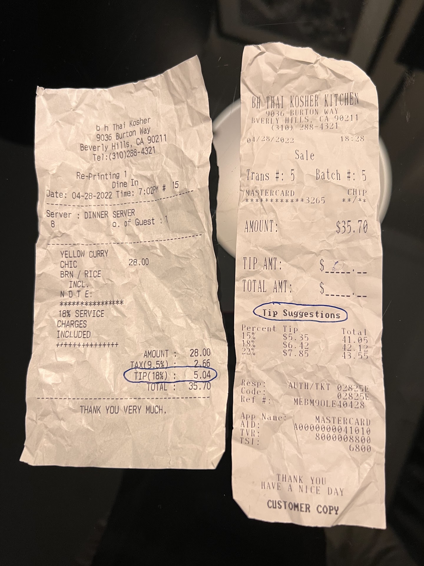 NEED TO WORK ON THEIR SERVICE Just left this place. 05/02/2019 @ 12:30 pm. Permit parking only or meter parking on the street. The place is small. There were enough tables available for two people to sit at. We ask to eat at a 4 person table seeing that there were two guys also sitting at a 4 person table already eating. The waiter didn't have any problems sitting us at a 4 person table. Then a rude Asian women came out from the back and said, loud enough for us to hear, that the table was for 4 people. We looked at each other and then sat at the table for 2. Instead of giving us menus right away the same waiter SITS DOWN at another table and begins a conversation with the people sitting/eating there. My husband had to ask him for menus after 5 minutes. This place went through different business names and we've eaten at this location many times. We thought we'd try it with the current name...Beverly Hills Thai Kosher . We will never go there again. There are MANY OTHER Thai restaurants that we dine at with superior service...NOT BEVERLY HILLS THAI KOSHER !!! POOR SERVICE. Too bad, we like to support the local...