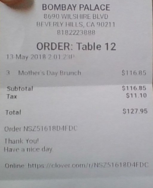 Here is what happened in detail. I went to Beverly Hill with my family on Mother's day. Being Indian I chose this place for lunch which was close by. We checked the price on google menu, nothing seems was special or out of way. We reached there and saw $14.99 for Mon-Fri buffet. I asked the lady at counter which seems to be owner of restaurant for place of 3. She show the way. We started filling plates with food. No water was served in first 15 of our arrival. I had to ask. No Naan which is main part of Indian buffet was served. Again I had to ask because my child could not start without it.