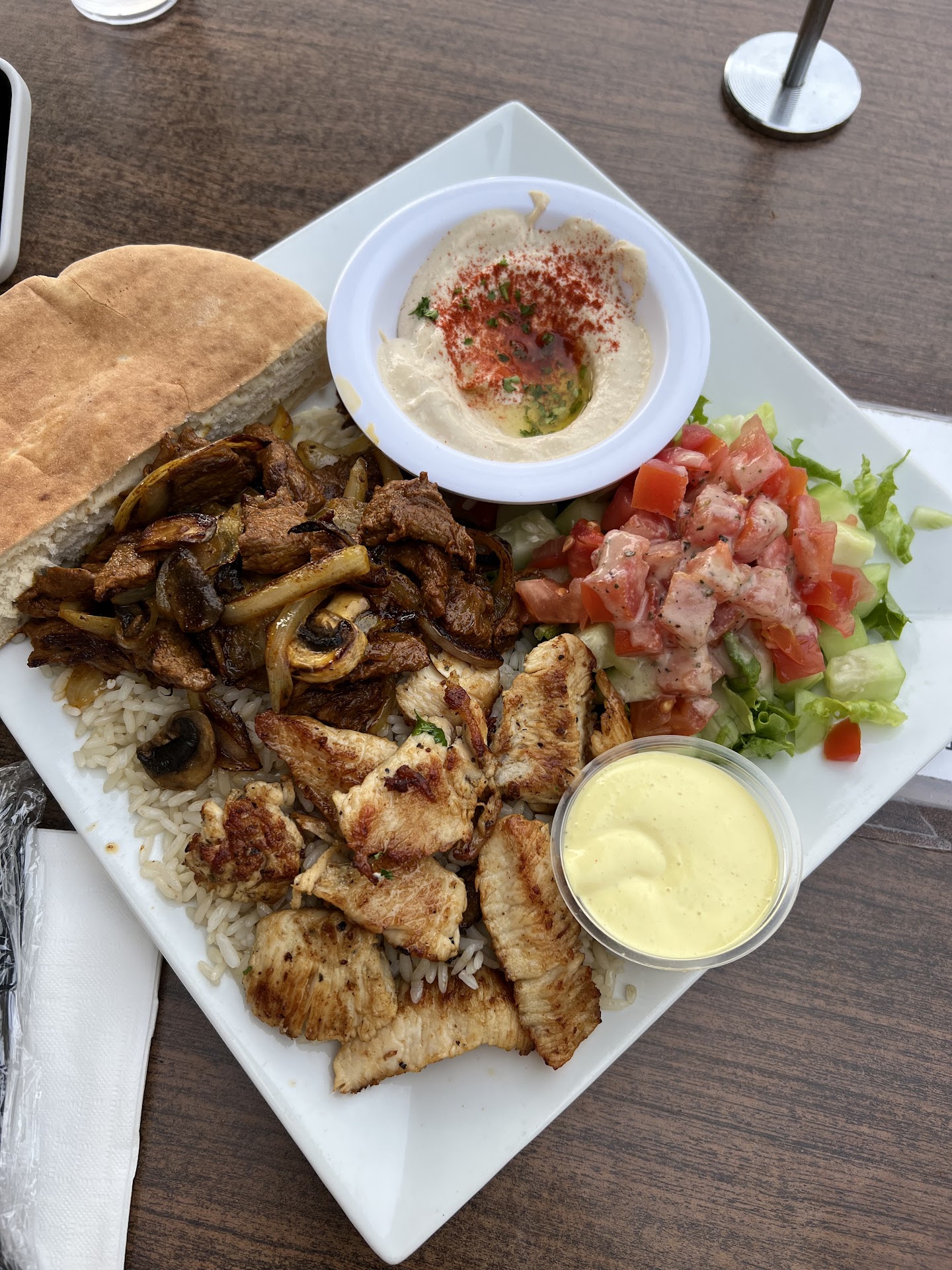 Read moreGreat place to get Mediterranean food and fulfill your cravings. It’s on south Beverly drive — a beautiful classy street with a lot of restaurants and cafes. It has outdoor seating which is nice and lots of spacious indoor seating too. Free water when you order. The service was fast and the portions were very generous. I ordered the meat combo - steak and lemon chicken and it came with fresh pita bread, hummus and cucumber tomatoe salad. You get a choice of rice or fries and I chose rice - very yummy! I also tried falafel here for the first time and got fries on the side as well. The falafel was good - crispy on the outside and green in the inside, and came with ample sauce. The fries were crispy and thick which I liked - if you’re more of a McDonald’s fries person you might not like the thick and crispy ness of these fries. Overall I enjoyed the ambience, the service, the food was really great and I would highly recommend coming here for Mediterranean food. It’s comparable to panini kabob grill — maybe a bit more upscale, and better than...