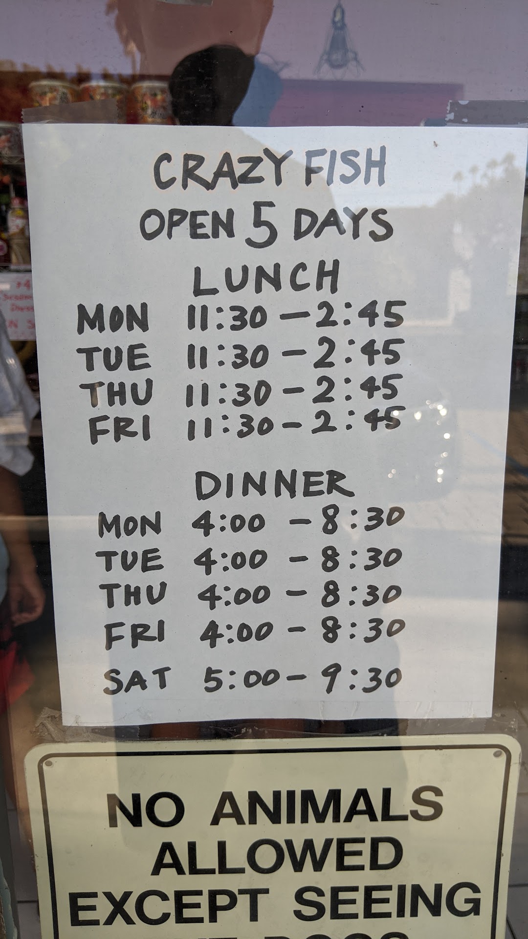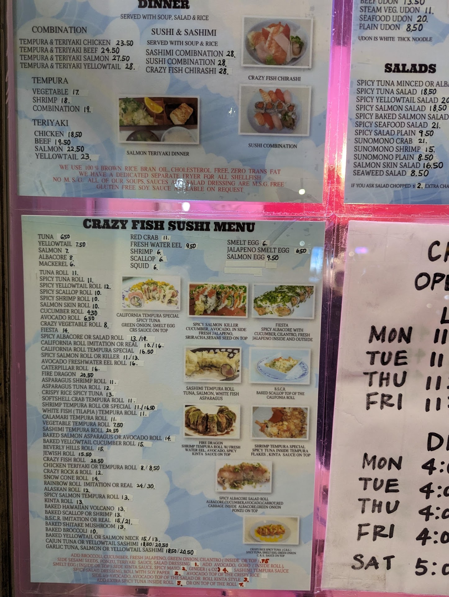 Read moreI love this place! I have been frequenting crazy fish since 1990 when they were a restaurant and now that they are takeout, I still go there. My wife loves them too and our boys always finish everything! I know there are a lot of haters out there, but this is a unique restaurant. Large portions and super fresh. I have seen some of the bad reviews and I cannot agree. They have been around for 30 years and still doing good business so they must be doing something right. The owners are good people and I really don't care if she wants to charge another $0.10 for a soy sauce. That seems to upset some of the reviewers. Okay