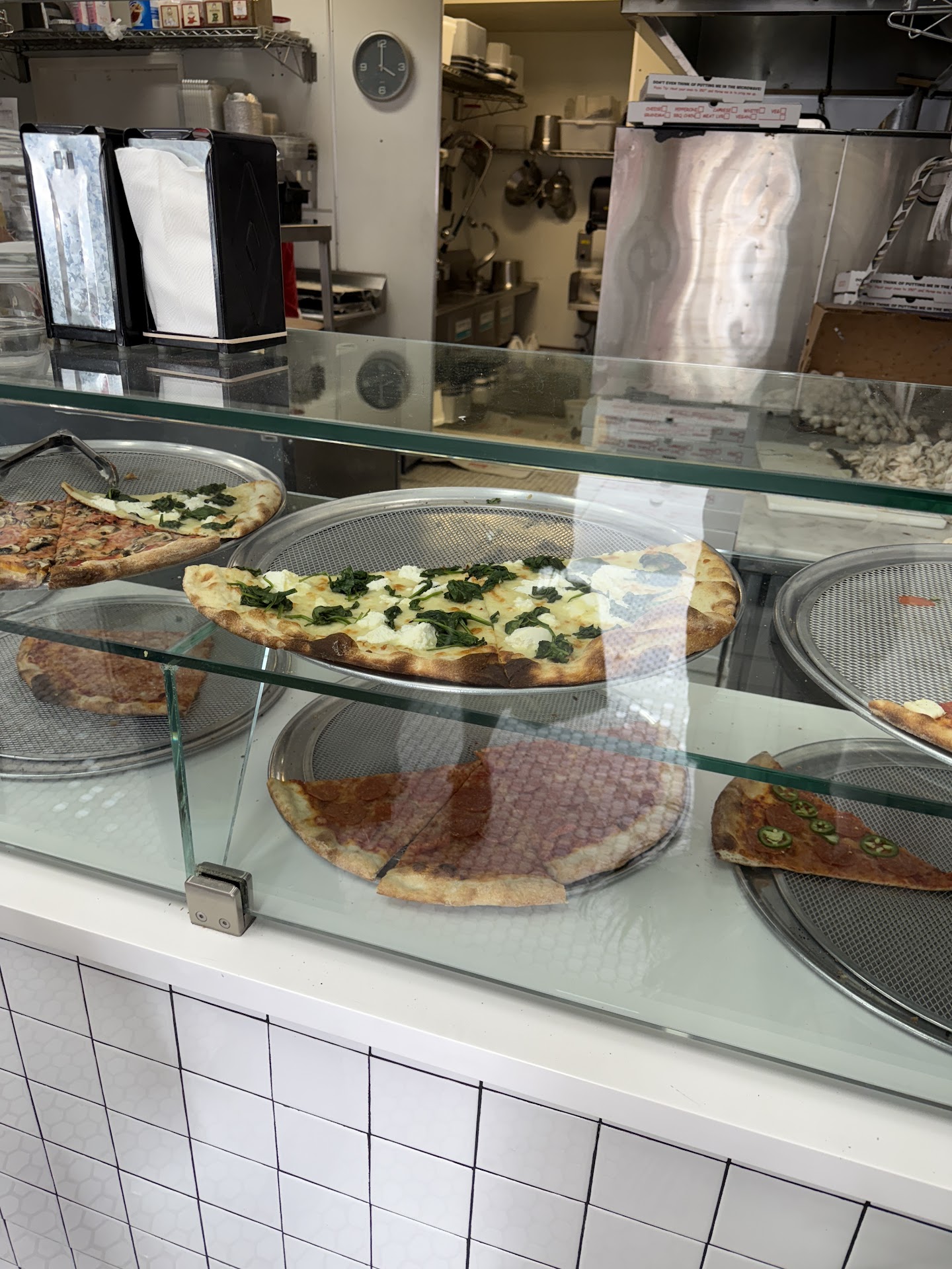 We visited for a quick bite, opting for two slices. Unfortunately, most of the pizzas on display did not appear particularly fresh, and slices are simply reheated in the oven before serving. The taste was mediocre at best, and the experience overall lacked the freshness and care one would expect from a location in this part of town. The price, around $10 for two slices, was acceptable, but considering the quality, it felt underwhelming.