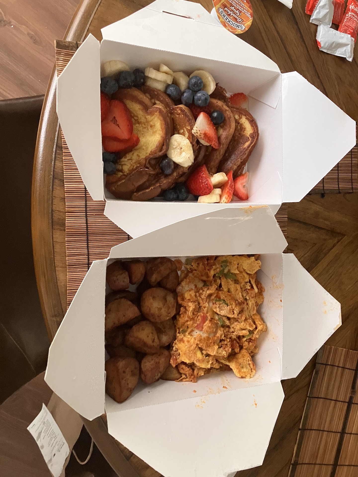 Service: I had gotten the French toast with bananas, blueberries and strawberries and order the southwestern omelet. They only put one syrup in the bag in which I wish there were more.