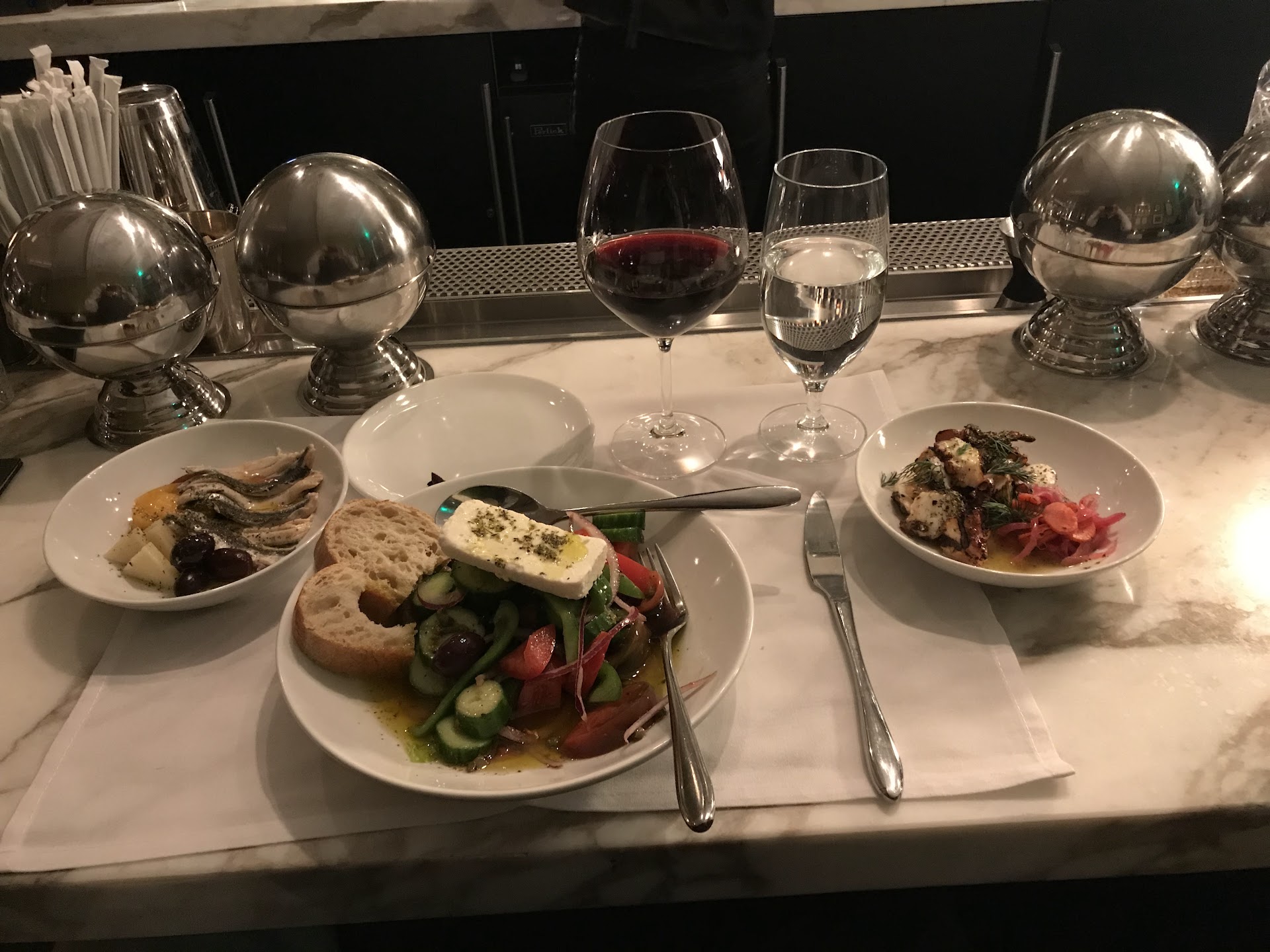 Food - 4.5 stars. Unfortunately I was by myself so couldn’t sample more of the menu. However, the dishes I had - Greek salad, marinated anchovies, and the octopus - were solid. The Greek salad won as the best dish with extremely fresh produce, outstanding olive oil, and good feta. I can recommend the other two dishes but not as “must-haves”. The moussaka was recommended and I would have liked to have tried it but there was only so much that could be consumed.