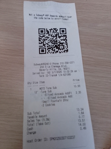 This subway is by far the best one I've had the pleasure of visiting a d I eat at subway at least 6 time a month really, but the young man who was working there on Jan. 04 2021 after 6pm was very efficient, professional and courteous. It was a memorable experience and whenever I'm in Beverly Hills I will frequent this establishment for sure go there and see for yourselves remember Anthony your doordash driver/ restraunt critic was on the scene at subway of Beverly Hills on La.cienaga Blvd...