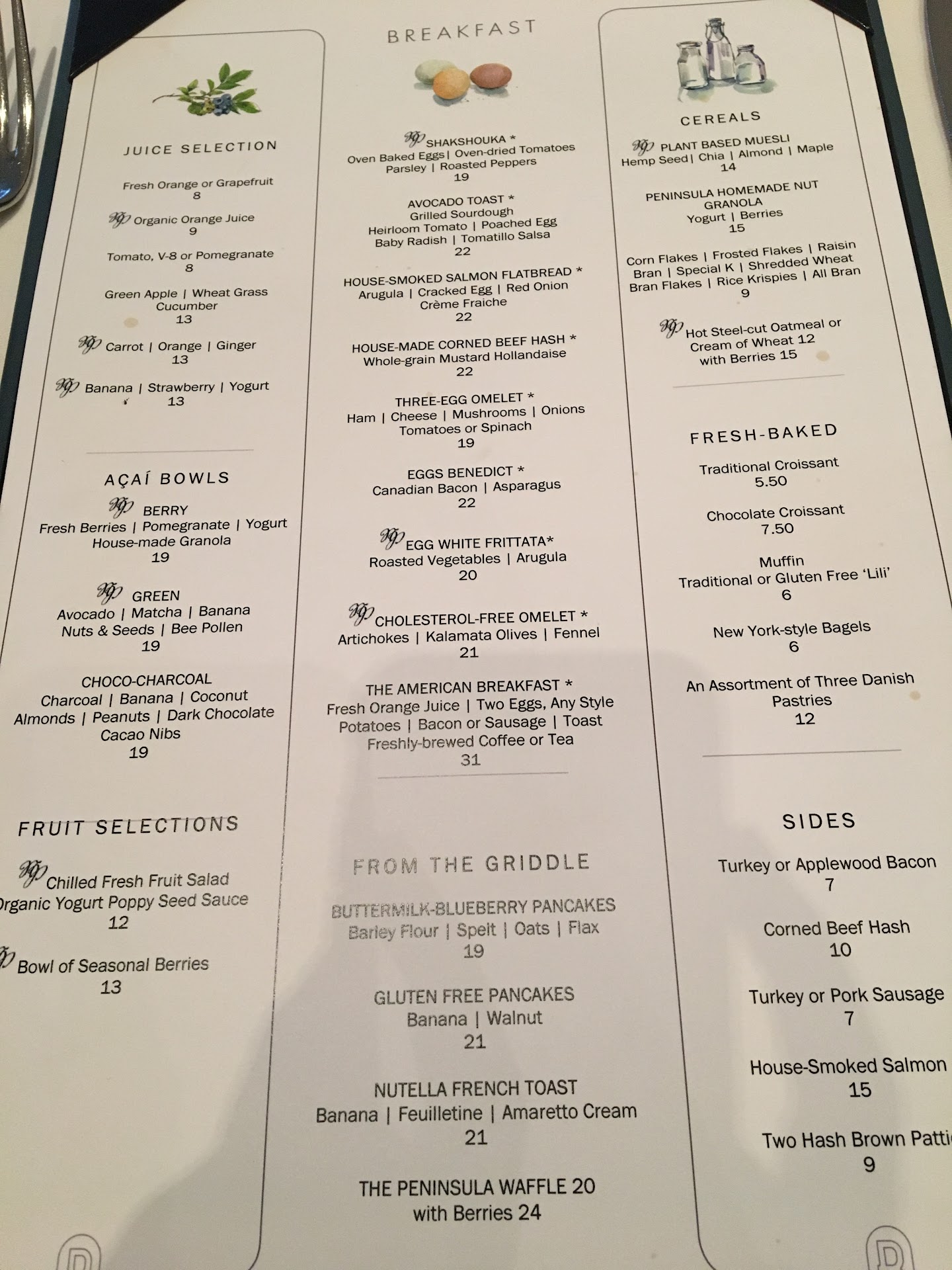 Read moreHigh end restaurant in the Peninsula Hotel. Came here for breakfast at 6:30am (right when they open) on a Friday morning. The hostess and the waiters were all very friendly and helpful. I was the first one to arrive to the table so I was taken to the table, and the hostess suggested I take the booth so I could get the view (I appreciated the suggestion!). The waiter came right away to ask if I wanted anything to drink. I had green tea and it came with honey and lemon on the side. The teapot it came in was very cute. I got the chocolate charcoal acai bowl which was $19. It was smooth and creamy, and came with cacao nibs, coconuts, peanuts, sliced almonds, and some succulent garnishing. It was delicious. I really liked the even distribution of toppings, particularly the cacao nibs. The bowl was small but the dish was surprisingly filling. I walked out very full. The waiter came by frequently to check if we wanted any more water or orange juice or if he could get us anything else. The ambiance was peaceful and very quiet. There is indoor and outdoor seating. I liked the aesthetics of the lobby as well. It was ornate but not garish. Overall, it’s a pricey place but if someone else is paying, I’d recommend coming here and enjoying...