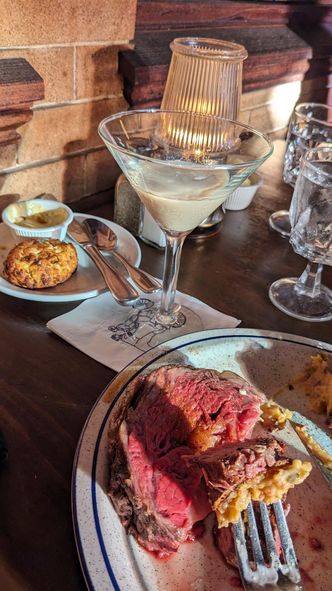 Our dinner comes out and mine was placed first, looked delicious and exactly what I ordered, my husbands meal on the other hand was a PRIME RIB cooked medium rare. My husband does not eat prime rib or does he eat medium rare. When we mentioned the mistake they offered to make a new meal. He declined because I would've been eating alone or if I waited for his correct meal to be cooked, my food would've been cold. He did eat a few bites but it was not to his liking. The manager came over, apologized and offered us 2 free desserts. We declined the desserts. I am not sure how 2 8$ desserts would compensate a$43.00 steak. I did mention that an offer of 2 desserts does not come close to the cost of the meal and the mistake so the only compensation they made was taking my 1 drink off the bill.