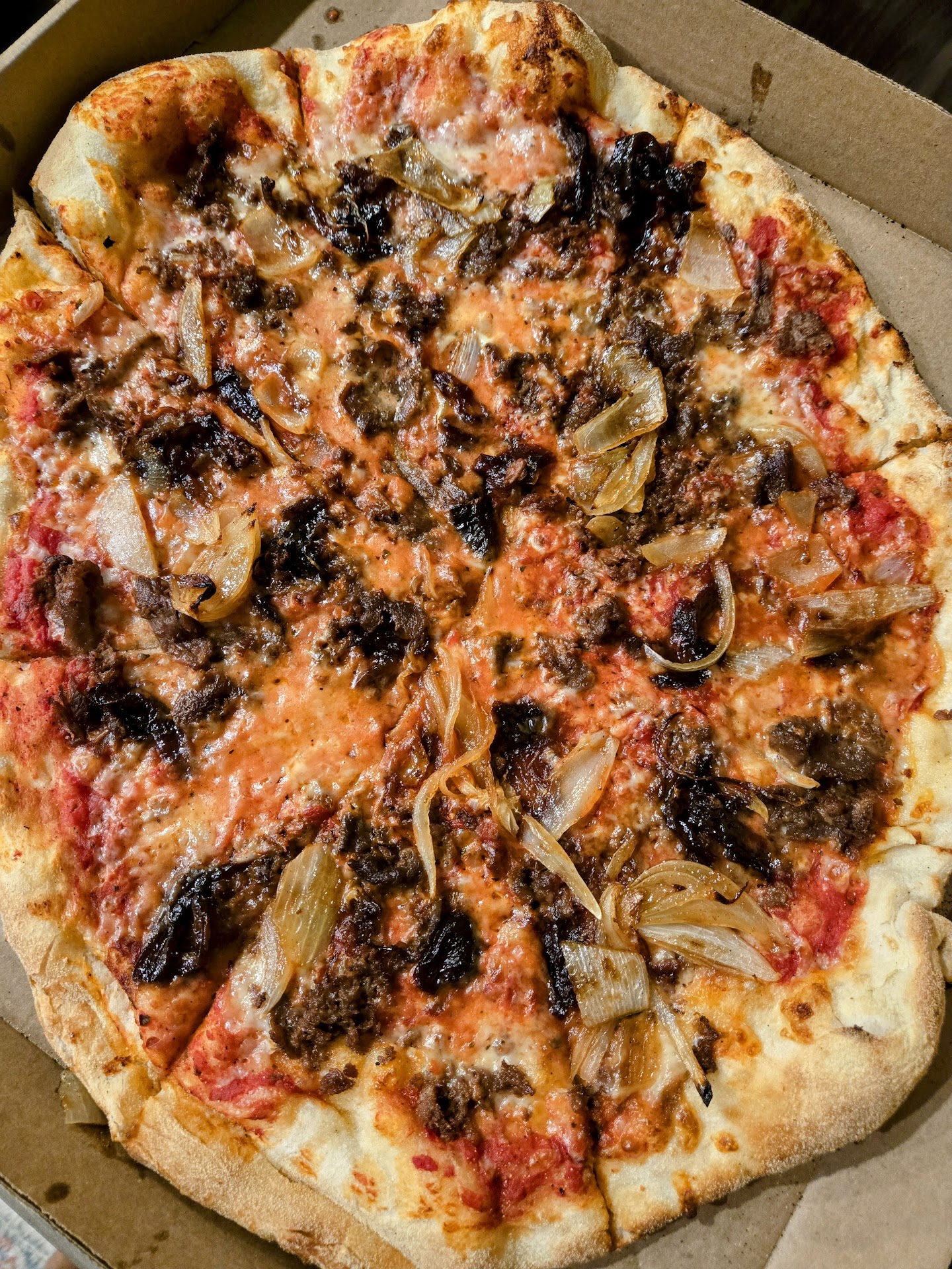 The steak pizza with caramelized onions was just as amazing. The sweet savory combo on that pizza hit different. Those were THE most caramelized onions I've ever had. I don't know what they did to achieve that level of caramelization, but it was next level and brought out an amazing smokey sweetness that complimented the tender savory steak. Instantly one of my favorite pizzas ever.