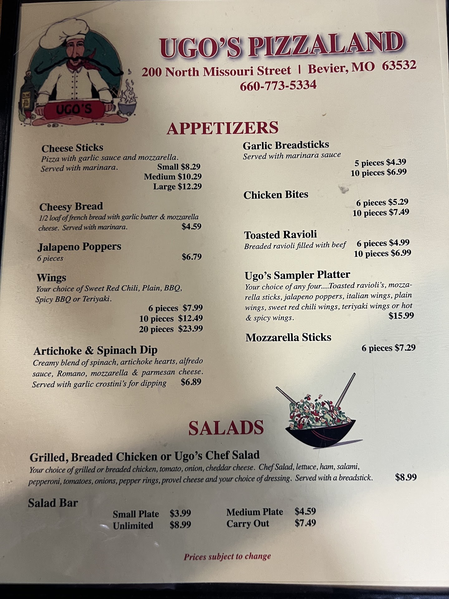 Read moreGreat pizza. Lots of other choices on the menu but I'm still stuck on the pizza. I plan to try the pasta and subs someday... Very nice and attentive staff. Clean and comfortable, casual atmosphere. Worth the drive if you don't live in Bevier. This is some of the best pizza in the northern half of Missouri. (I can't speak for the southern half. Hook and Ladder in Hollister is the only pizza I've tried south of Lake Ozark. It was very good, but I don't think better than Ugo's.) I like thin crust supreme. Like eating slices of heaven. My son goes for hand-tossed pepperoni. Also very delicious. If you prefer deep dish pizza you may need to order bread sticks to get your dough on. But the cheese is a meltilicious blend with a crusty edge. The sauce is complementary to the flavor profile of the cheese and the crust. Can't say enough good things about Ugo's pizza. Try it. You won't be...