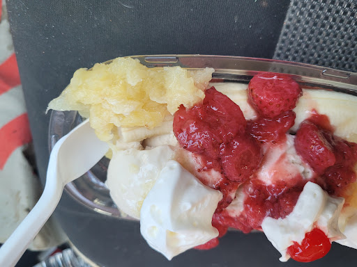 Read moreI was craving a banana split and dq was slammed so I stopped here. The girl working seemed confused. I asked if I could have the peanut butter ice cream and after checking she said they only had 1 scoop left so I said ok I'll have that and the rest vanilla. I only wanted strawberry and pineapple toppings and she asked what I wanted for the 3d toppings. 1/2 strawberry and 1/2 pineapple. She asked if I wanted whip cream and cherry (yes) and I let her know I was taking it home to eat (they used to have covers)