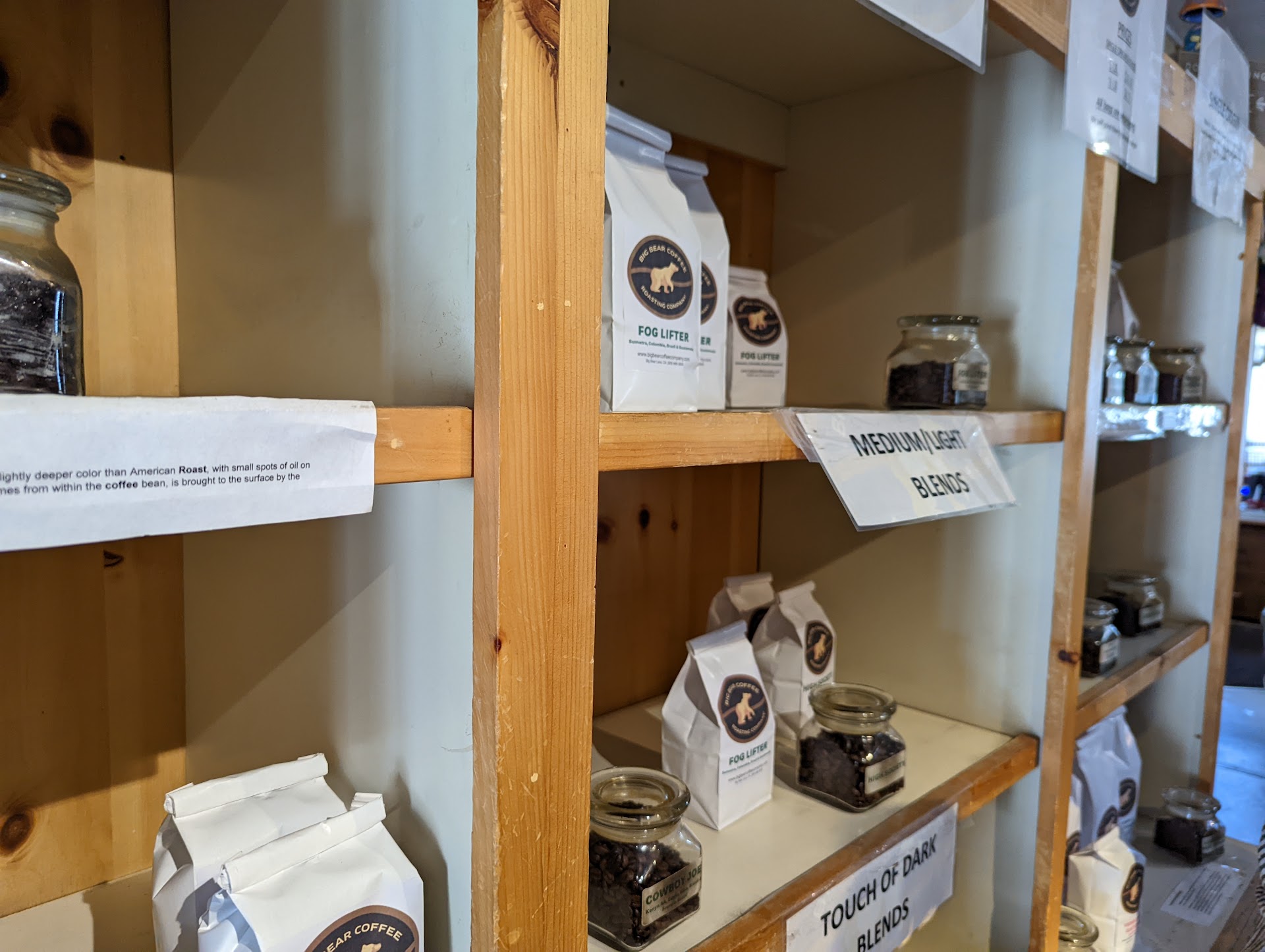 Read moreI think the espresso beverages here are little strong. Small=3 shots,medium=4 shots. But it's a roaster and I am rating this place based on their beans. Normally I am not a big fan of flavored beans, they usually hide something. I bought 2 bags of flavoured beans, each had relatively recent roast dates. They extract great espresso, smell and taste fantastic too. There are sample bean jars on the shelf you can see and smell before buying a bag. Their bean bags don't have valves, and the wait time in the shop was a little high due to it being a one-man show at the time (this labor shortage warning was posted at the door, so can't blame him). Also the opening time was one hour later than what Google suggested (might change back). If you are a coffee lover of any kind, or looking for a gift, this is a must-go place in Big Bear before you...