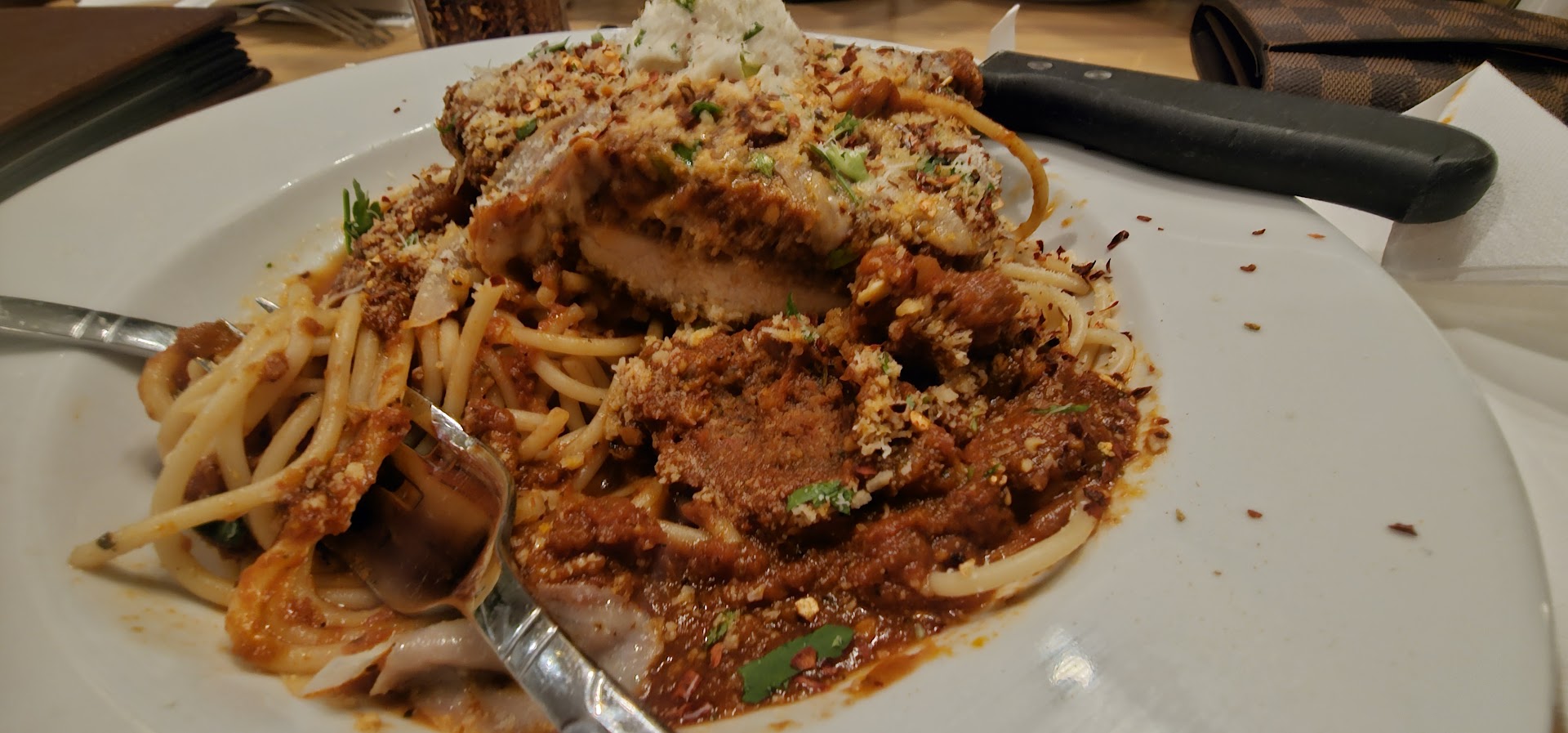 I started with a nice glass of red unshackled prisoner wine and it was just lovely. Nice and dry with some lovely tannins. I then had the steamed artichoke and it was the best I have ever had. The gremolata they pour over it was loaded in lovely fresh herbs and garlic , and the side serving sauce of lemon mayonnaise was out of this world. I had to take a little container of it home. And then I went on to the chicken piccata, but did not want the pasta as a bed so I chose the seasoned vegetables and they were lovely. I love garlic and everything had just a right amount of it! Chicken was tender. Even the little side insalata misto was perfection. Just the right amount of light zesty vinaigrette with some Kalamata olives and a lot of shaved Parmesan.