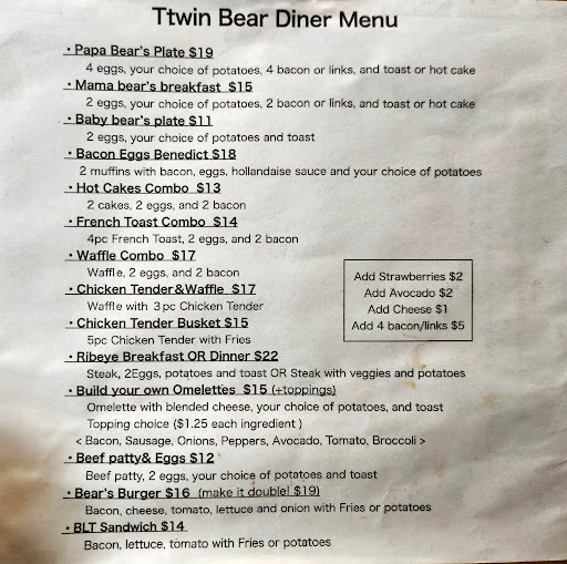 I wouldn’t go here again… just go to the grizzly manor cafe if you want amazing food and service. Ttwin bear was slow and I did feel bad as there was only 2 waitresses. One who was well trained and one very new one. Our new waitress got the order wrong multiple times, continued to come back to the table and say they didnt have that item available (which happened four times—then got two orders wrong when they came). She did come back multiple times though to check if we were alright which was good. She was just new and it isn’t really her fault. The poor rating is due to the multiple other staff members who could have been bussing tables, filling coffees and water and seating people and instead were on their phones watching these poor girls serve many tables and huge parties and seat people, and answer the phones, and bus tables! When we went to the back counter to ask for a menu since we could see it was busy, the man standing there left to the back the second we arrived at the counter and wouldn’t come out. we heard another staff member tell him to come out and help us and stop hiding. Drinks are expensive and coffee is nearly $5! The booth seats were all ripped up and not super comfortable. Again I probably wouldn’t...