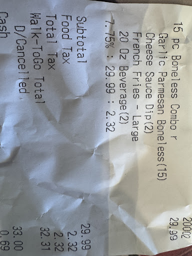 Today (08/18/25) was my first and Last visit to this crummy restaurant. Reluctantly, I ordered the Six Piece Garlic/Parm Combo (total was $16.69). The Chicken (nuggets style) were hard as a rock and the French Fries were greasy and burnt. The employee was covered with Tattoos and did not wear gloves or a face mask while preparing my food. I should have requested a refund, but did not want to have a confrontation with the employees. My visit was during lunch time and I was the only patron in the establishment. I later checked their reviews, which says it all - avoid this place...