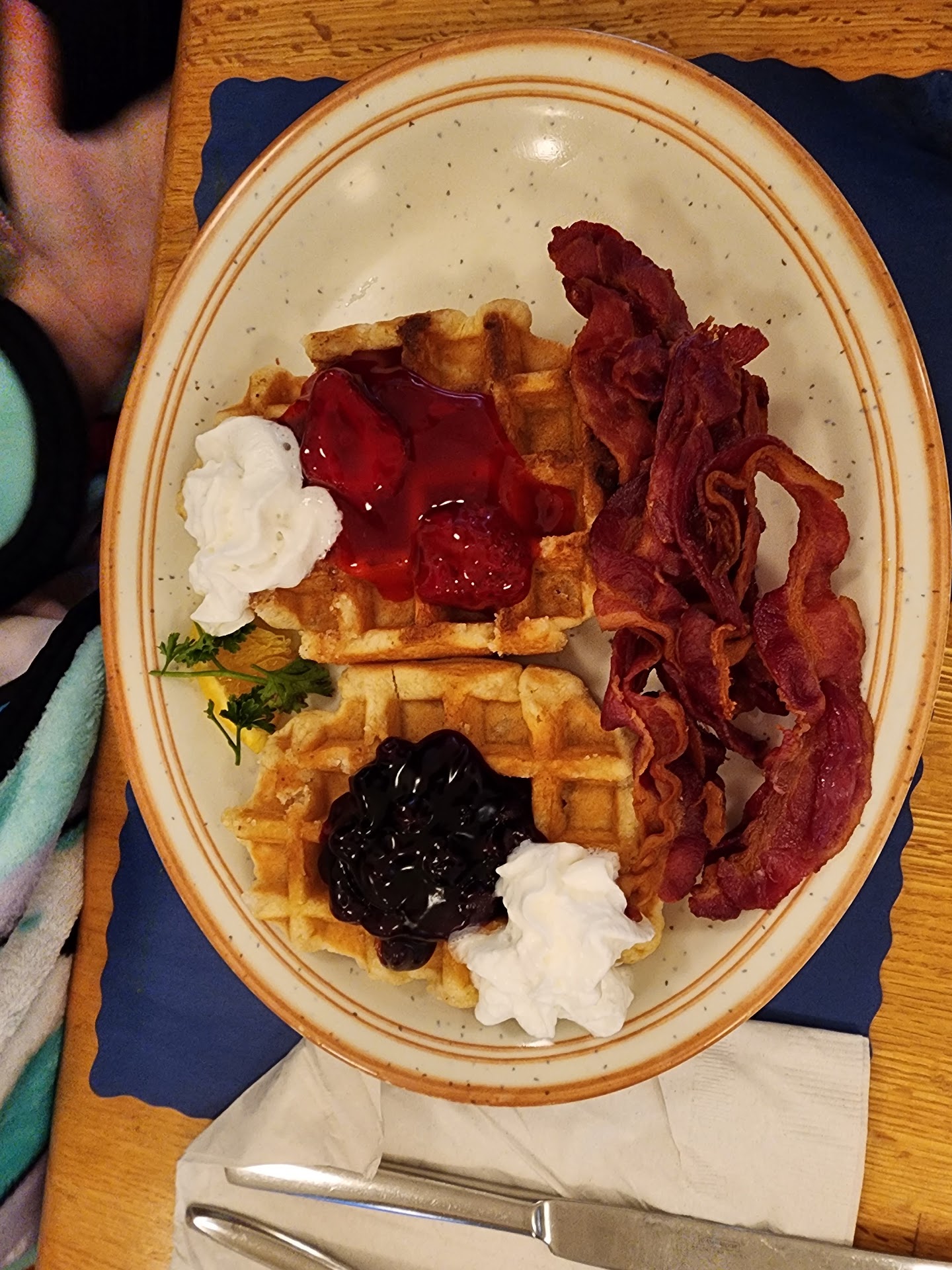 The red, white and blue waffles are two homemade waffles with strawberries, blueberries, and cream. They were served with a copious amount of bacon, and two eggs served to preference (my daughter chose egg whites). My daughter ate nearly the entire plate and she is one of my pickiest eaters. She stated over and over how delicious everything was. I snuck a bite of her waffle (for the review, obviously) and it was perfectly crispy on the outside and soft on the inside. The strawberries were sweet and delicious.