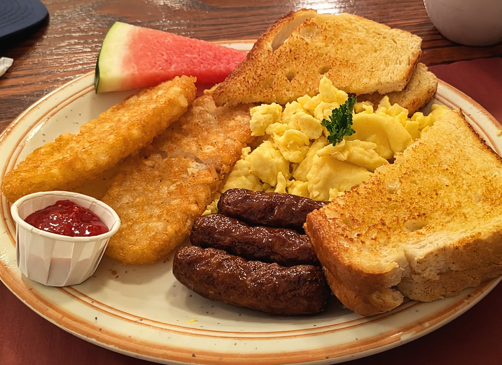 Ā Ā Ā Read moreWe like to take "breakfast"road trips out of town to try new breakfast places. This was an hour drive; two hours round trip. The menu looked promising. The reviews looked promising. However we left the restaurant rating it two stars... and crossing it off our 'come back again' list. Being labeled the best breakfast place in Mecosta County is misleading. Not so. When we arrived we waited a long time just to be seated. Once seated by the manager, we asked for coffee and water... no coffee returned. No water. Our waitress finally came to our table after we were already waiting too long without water or coffee. She was ready to take our order when I asked to have my coffee first. The waitress was bubbly and very friendly and attentive. I ordered the red white and blue waffles, 2 eggs and sausage. When our meal finally arrived, the sausage was nasty pre-cooked Gordon Food service cafeteria sausage... I sent it back to exchange for bacon which was delicious. Then I took a bite of my eggs and found a short hair in my mouth! So gross. (I have long hair).... I asked for the manager. All I wanted was for the egg to be replaced. She wanted to convince me it wasn't a hair... however we raise chickens, AND I know a hair when I see one! I was a hairstylist for many years. The waffle was a huge disappointment. Apparently they bake a sugar coating into the waffle, that made it sappy sweet and uncomfortably crunchy, like gritty crunchy, all while trying to chew a bite. The 2 waffles were a little bigger than an english muffin in size each. They were terribly dense. Not light and fluffy as I had an appetite for after dieting for 9 months. What a disappointment. My husband's order was the wagon wheel. Nothing special, nasty sausage, undercooked overeasy eggs, sausage gravy unexciting without much flavor. Our bill $30, but we really liked our waitress leaving a $7 tip. The staff was all very friendly and kind. Atmosphere was nice, inviting, clean, and had a fun ambience. Our meal...