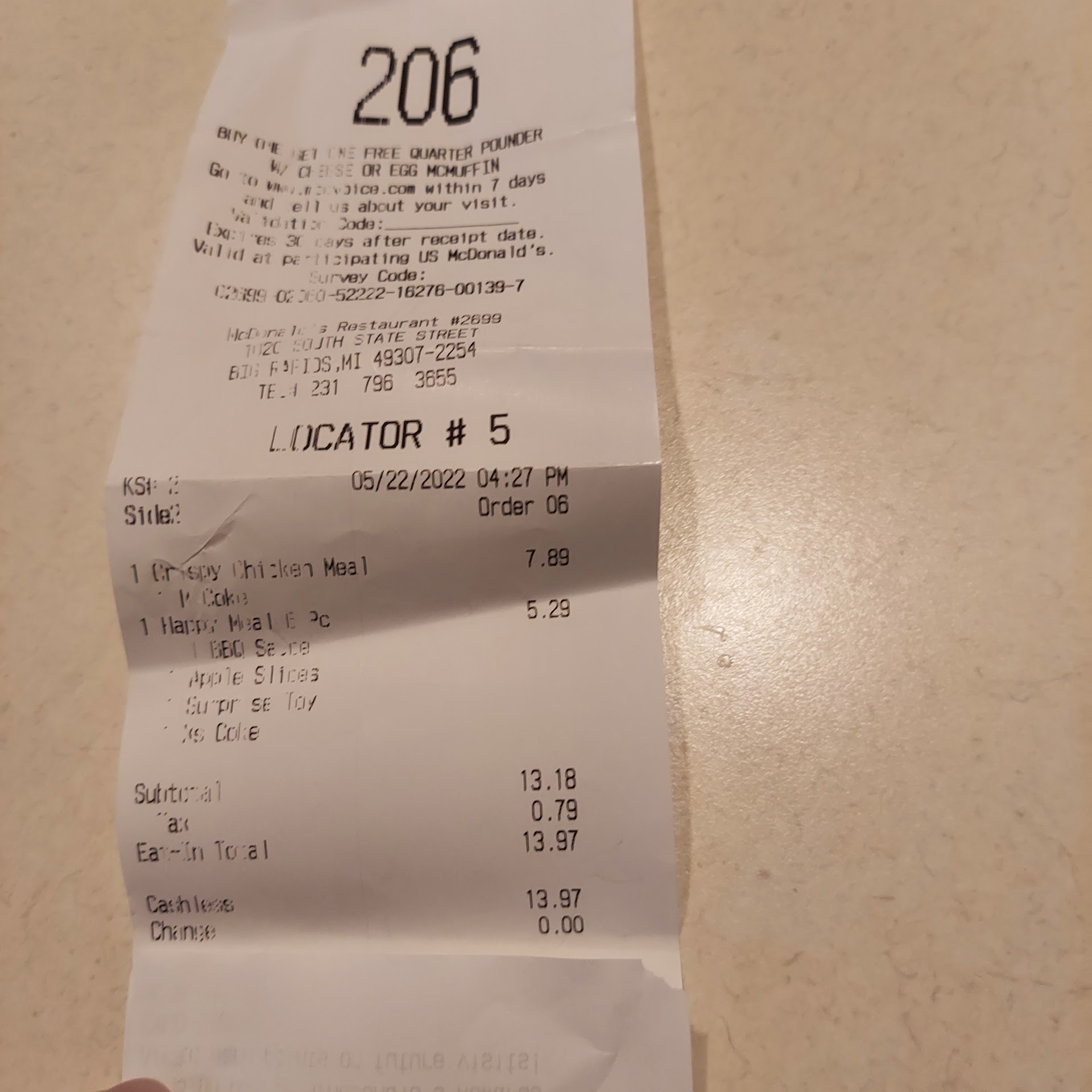 Read moreIf I could rate this McDonaldâs zero stars, I would! Negative stars would be a great option also! My husband and I mistakenly got off the exit because it erroneously leads people to believe that this McDonaldâs is right off the highway-untrue! After following the busy âcollege townâ road to just âhappenâ to see the Golden Arches, we found our way from I-196 to this particular McDonaldâsđregular two-lane drive-thru, my husband places our order to be line jumped by someone in lane 2...we get up to the window to pay and they repeat our order(all good at this point, they are busy, and as a former fast-food manager-I get it!) because of the âline-jumperâ our order is screwed up by the time we get to the next window...at this time, weâre asked to pull forward, which I still have no problem with, by the way! My order was a 1/4 pound/cheese, a double cheeseburger, McDouble, 2 medium fries-no specials! Simple! I watched them serve 7 customers with around the same size bags, I also witnessed the gal behind me in the drive-thru come back to return her wrong order! When I finally did receive my order I was greeted by your robotic mc manager telling me to have a good day! Great way to train the kids there! No âIâm sorry for your wait, I apologize, no nothing!â Sorry, but you guys obviously donât k ow whatâs going on, and honestly, Burger King is doing a much better job on the âservice sideâ they will get my business from...