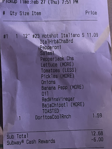 Read moreI am super annoyed by this store and subway itself. I ordered from here last week got my order home and both of my subs smelled so awful and sour. When I took a bite the chicken was so mushy I almost threw up. I have been trying to get in contact with this store also I have went on the app and filed a complaint and someone said to wait for an email with a resolution. I got an email but it said how satisfied are you with the resolution. There was no resolution. I didnt get refunded nor did I get a sorry or anything from subway at all. I order from subway all the time and love it. But this store specifically i will never order from again. Its so sad now a days you can't even call and talk to a manager and you have to go through the online crap and bots and no human at all. Its ridiculous. ALSO TO ADD TO THIS THEY GOT MY ODER...