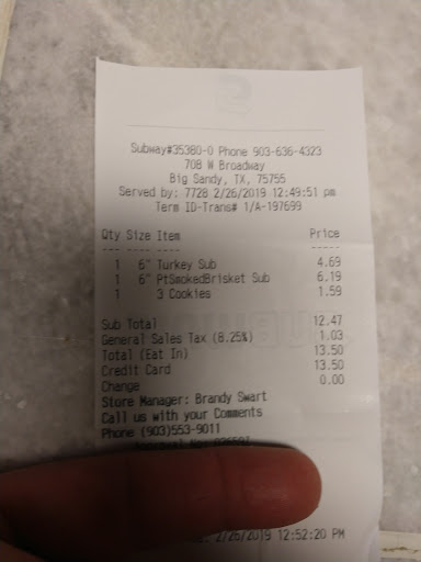 Sad. We are local (about a 12 minute drive) and used the App to place our order. Picked it, got home, was all ready and excited to eat. DOWNER!!! The bread was not what we ordered (wrong kind) and none of the 4 foot long's were toasted as specified in the order. We paid extra for "extra banana peppers. None were to be found. Paid extra for bacon on my #2 Outlaw.... It was so thin and not detectable in a bite of it. Would you be surprised if I mentioned that the foot long tuna that was ordered "with all the vegetables" had 3 slices of tomato over the whole 12 inches! Other vegs missing, including the jalapenos (well, there two or three)! It was a mess. See attached photoā¹. We have called them to complain numerous times in the last 20 minutes and you guessed it...No answer! Key takeaways... #1. If you want you order to go right, go in and supervise them as they make it. #2. This kind of pathetic service is a direct reflection on the manager/Franchise Owner. #3. I've learned that this small town has only this one restaurant available (there is an amazing Mexican place, Taqueria El Unico, but their hours are limited) so they are getting away with this poor service because there is no other option. Crawfish place, but it's not really a drive through. #4. The food was fresh (it seemed) and did taste good...so I couldn't go down to a 1 Star review. Maybe make customer's orders as if you were serving your own family at a...