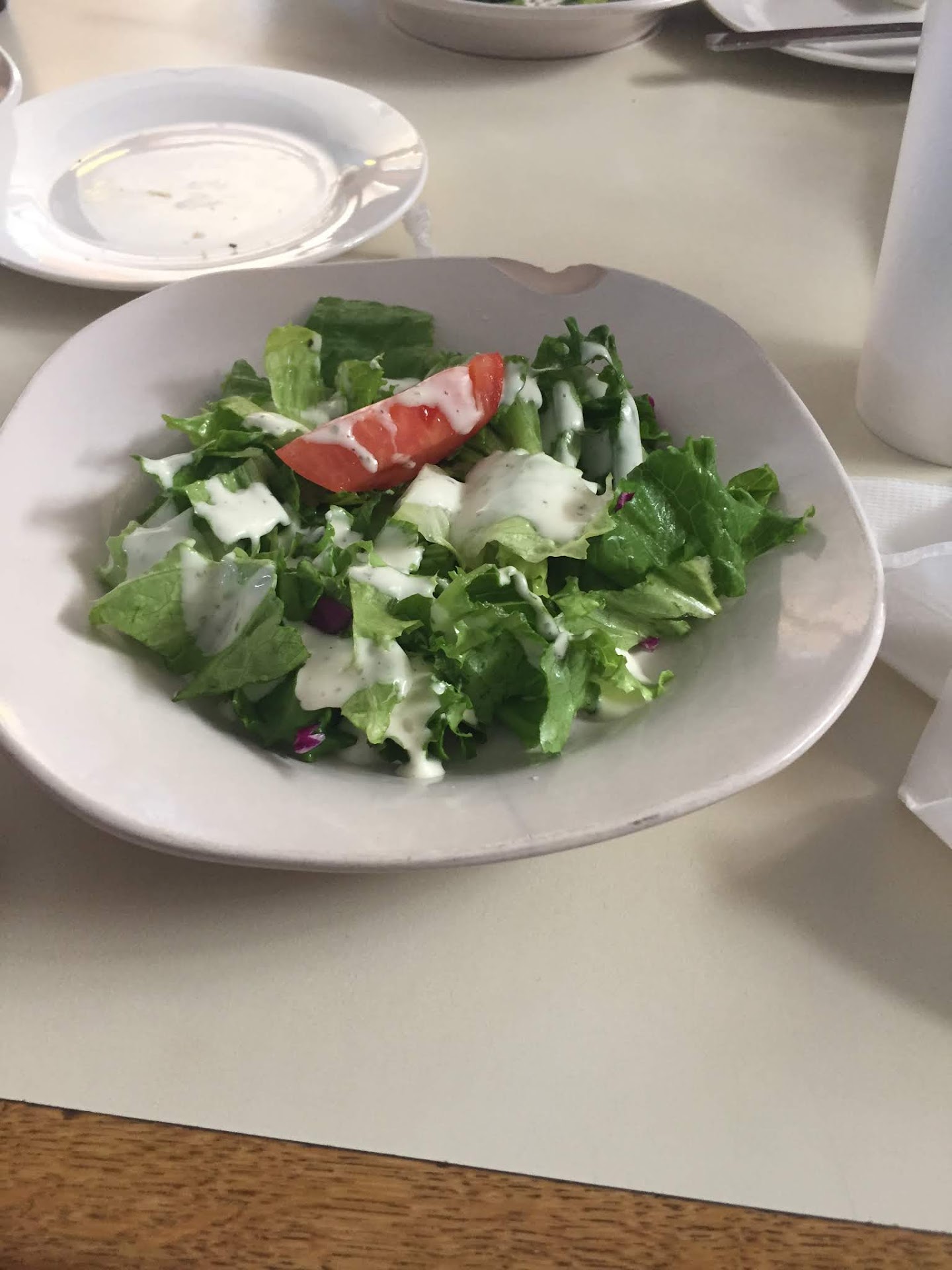 The “salad” like many have mentioned is chopped, wilted iceberg with a slice of tomato. The tomato vinaigrette house dressing is actually really tasty however.