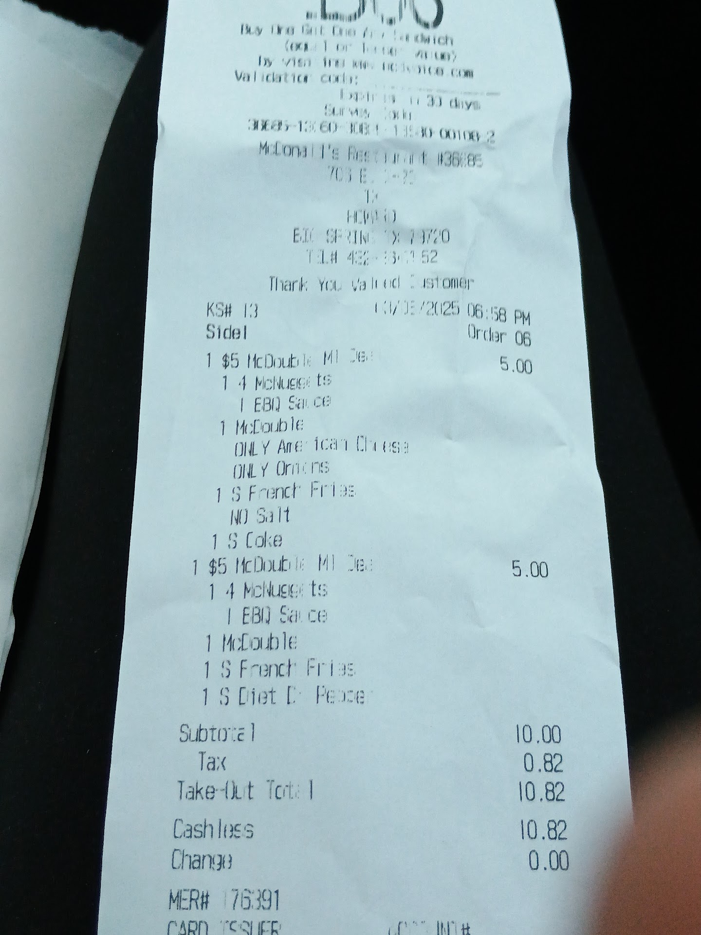 Read moreNot a great experience. We drove for 12 hours and stopped to grab dinner. Ordered our double cheese burger meals. 1 was no onion no salt on burger and no salt on fries. The other was everything as normal. Both were with hot mustard for the 4 chicken nuggets for each meal. I Repeated order 3 times at drive thru. Pulled forward to pay. Had him repeat the order back. He said 2 meals 1 extra onions and only cheese. Other normal. I said no and repeated my order again 2 more times. He said I got it. I paid and he handed me a receipt I pulled forward but read the receipt and the order was still wrong. I told the pickup window person and he said he would go tell them. He came back and said cheese and extra onions right?? I said no!! My husband is allergic to onions and he can't have salt at all. Well after waiting at the window for another 15 minutes we got our food jumped back on hwy. Opened bags to eat and he got a cheeseburger with cheese only. And no chicken nuggets!! Hot mustard was in the bag But no nuggets. We didn't turn around because we already wasted over 30 minutes ordering and waiting. Ugh Very very disappointed. McDonald's is our go to place for a quick hot...