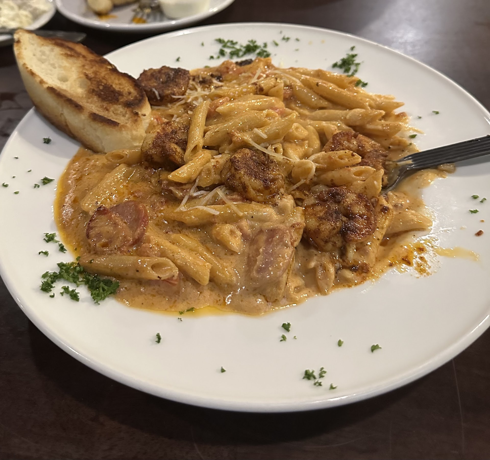 As for the food I got the spicy chicken sandwich for 18$. At that price it doesn’t come with a drink so i expect a good portion and it did not disappoint. Taste was also there they have great fries and the chicken sandwich itself was tasty and spicy as advertised. My partner got a pasta and it was 25$ no drink. Portion size was small for that price but they did not skimp on the shrimp and sausage. Taste was very good not as strong as I would’ve liked but very calming. Food was on point specially for a busy day as well as service.