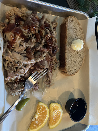 The menu advertises platters come with citrus, pickled veggies, and house-made bread. His platter had about 1/3 cup pulled pork, 2 small 1/4â slices of tri-tip, maybe 3 ounces at best, and 4 medium shrimp. The rest of the tray was sparsely decorated with a slice of bread, a scoop of tasteless, oily margarine, ONE tiny pickled hot pepper about the size of the top of our pinky joints, and two 1/4 inch orange slices, not even a juicy wedge.