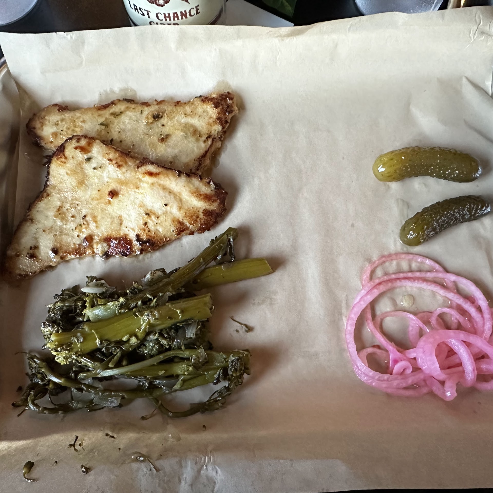 Our server asked, âWhat we will be feasting on tonight?â He ordered the most expensive item, âBroctopusâ Bounty,â sounding like a Kingâs sort of platter. He wanted to try all the meats, but was most excited about the pickled vegetables advertised with the platter. I had the Pirateâs Pork, with BBQ sauce.