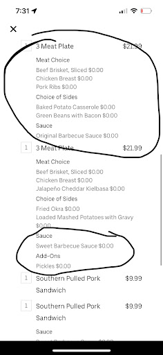 Read moreI placed an order tonight through Uber eats around 7pm. Two giant bakers with meat and two kids meals and an additional side of okra. However what I received was 1 singular giant baker with meat. No bbq sauces either, and a side of loaded mashed potatoes, and a large Sweet tea. So over half of my order was missing and the items we did receive were not correct. Now mind you I immediately try resolving the issue through the app, I understand that this is no fault to Dickeys but I was only able to be refunded half my order, no redelivery options available. So I thought I would try to reach out to the establishment themselves to see if they could just make the items I was missing and I would pick it up, because my kids were upset and at this point fairly hungry. As was I. I call the store, and there was an option to press if you had issues with a third party order and so I press option three to just get a message telling me to resolve the issues in the app for the third party delivery. Frustrated I get back to the main menu of the phone tree in attempts to talk to someone, however it was absolutely fruitless. I could understand maybe they were out of certain items for my order, but nobody tried to contact me about this, and if they were out of items for over half my order why even bother confirming the order? Why wouldn’t they cancel the order, or why would they be accepting orders? I don’t know if that was the case or not, but to receive not even half of my items is completely inexcusable. Shout out to McDonald’s though, I was able to get my children fed, had amazing customer service, and we received all...