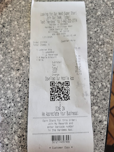 Read moreWe went through the drive thru this morning, and had the ABSOLUTE BEST customer service I’ve had in this town in a VERY long time!! I honestly just couldn’t get over how friendly, and polite the young man was. Seriously I was recently out at a sit down restaurant here in Billings, and our waitress, was moderately friendly and the service was mediocre. In the world we are currently living in, customer service has gone by the way-side. I called back shortly after we were there to let the manager know how impressed I was, and the young man that helped us was Lane…. Lane: I know Hardee’s isn’t your forever job, but you’re already ahead of the game in comparison, to many other individuals, your age! Just from our interaction with you today, I can see that you will have incredible success in your future!! Keep doing what you’re doing, and those character traits that we got to see and experience today, will take you far in life! Friendly, courteous, manners…you had it all…