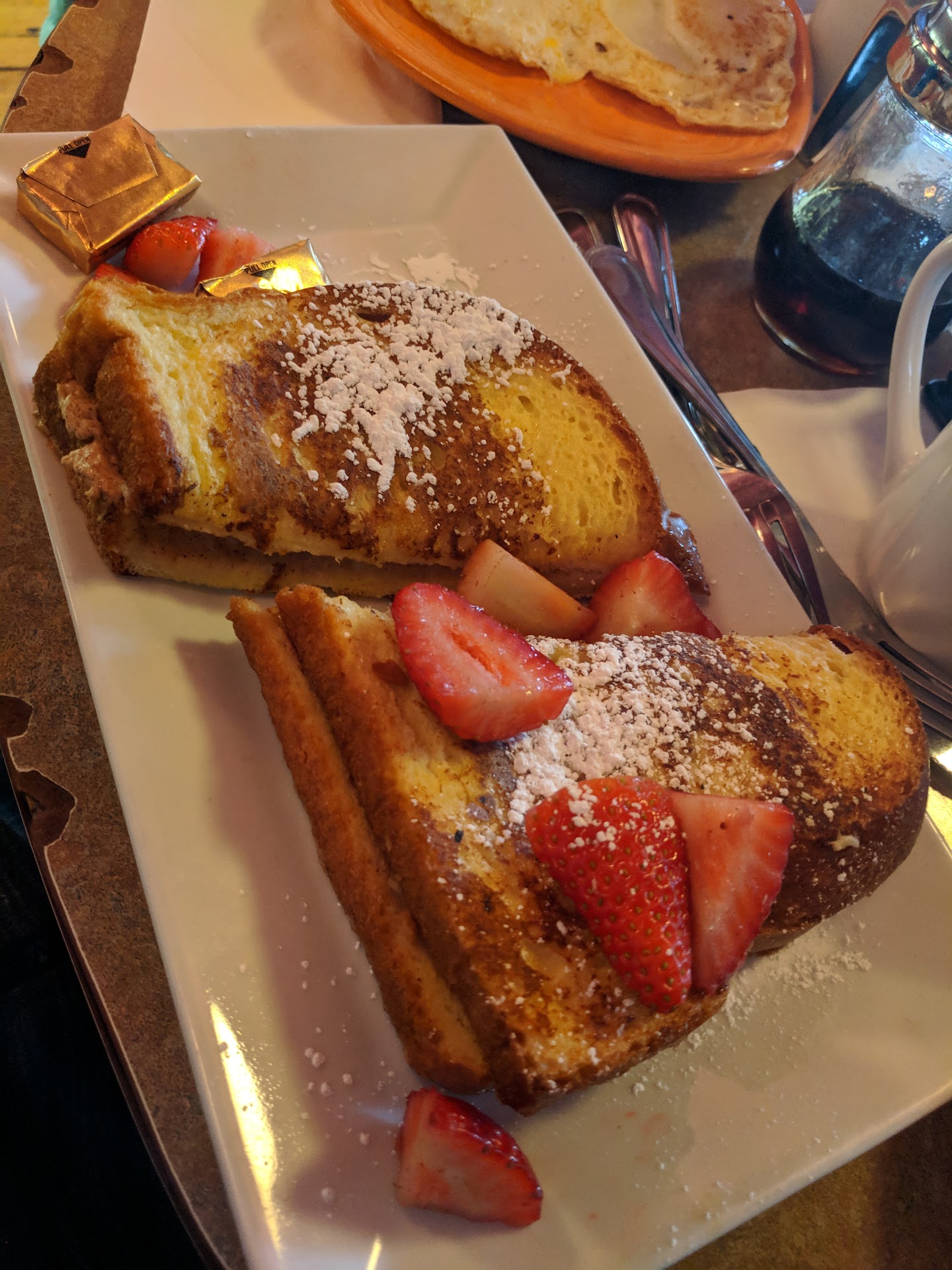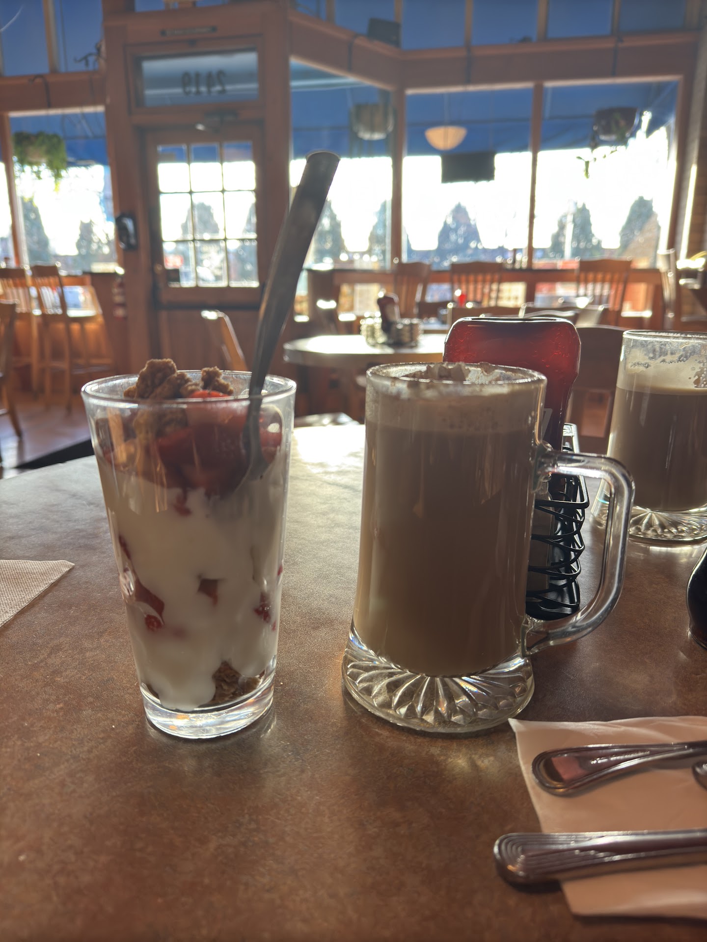 I had the granola parfait it was a nice size with equal granola equal strawberries. My brother had Oxford French toast that was good with fruit which we wouldn’t get again. It was just canned fruit with some strawberries for 5.00.