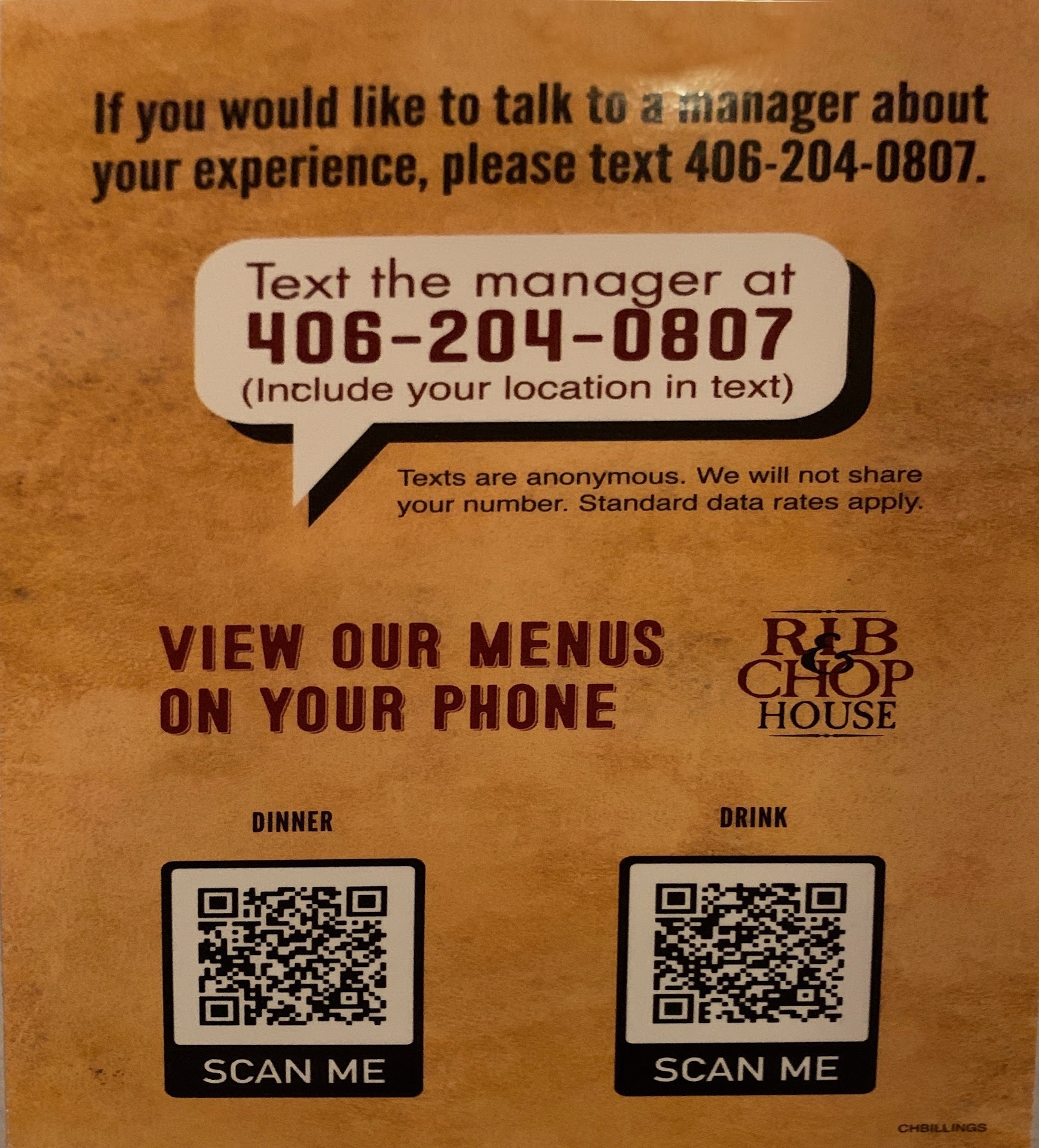 Read moreMy fiancĂ© and I came to Billings for our date night last Sunday and decided we'd go to the the Rib & Chop House as it was in walking distance of our hotel. It was not busy at all so I was quite confused as to why the four tables of people needed to be seated right on top of each other when there was obviously plenty of open seating. That definitely took away from the atmosphere for us as we felt crammed with the other tables, and not much for privacy. Our server was Tami. After we ordered our drinks and an appetizer she informed us of the specials of the night which included a wagyu steak special. My fiancĂ© and I both decided on the wagyu, each with a side salad as well as the mac nâ cheese and sautĂ©ed mushrooms. I will note the drinks were great, as well as our appetizer. The salads were average. When the steaks and our side dishes finally arrived I thought it was odd for our steak plates to be sizzling hot, as if they were just microwaved. However both our side dishes were cold. Upon further inspection, our âwagyu steaksâ looked exactly like the Baseball-Cut Top Sirloin off the regular menu. Nevertheless, we finished our meals and honestly were not yet disappointed with our experience at this point in the night because after all we were just out for a night of fun. When the check arrived we decided to leave a generous tip even though the meal was overpriced for such low quality. But as someone who also works in the food industry, I felt our tip would be truly appreciated, as I myself am always very grateful for tips and understand that the customer is choosing to splurge their hard earned money. We were the last customers in the restaurant when Tami took our bill, and as soon as she made her way to the rest of her coworkers we heard her very clearly snicker to the rest, âWow, I feel bad for taking these peopleâs money, they just gave us a $70 dollar tip for microwaved steaks.â The rest of her coworkers joined in at laughing and mocking us. We were absolutely shocked by their ungrateful behavior, especially our server Tami. On the Billings Rib & Chop House website youâll find their âValues & Beliefsâ, to which Accountability is among some of their values on the list and I quote, âWe hold ourselves to the highest standards because it is the right thing to do.â After speaking with the manager about this awful experience, I truly hope Tami and the rest of her coworkers take accountability for their unprofessional behavior, and strive for a better âSense of Serviceâ (another Rib & Chop âValueâ) for future inevitable customers. However, we certainly do not recommend the Billings Rib & Chop House after this...