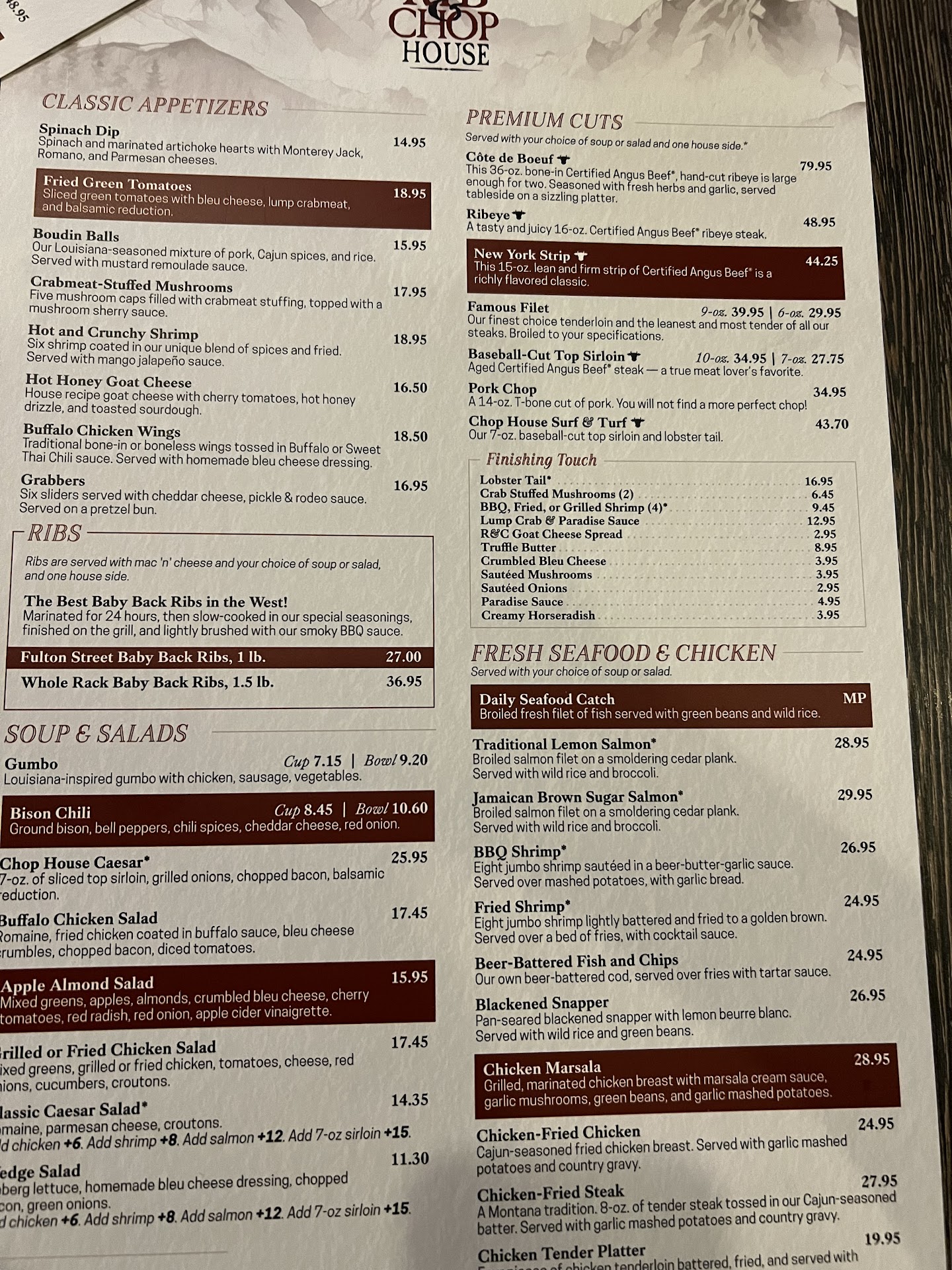 Rib and Chop House was a bit busy when we first arrived but mostly empty when we left. A few years ago it was mostly full for several hours. Our meal was $92 plus tip, compared to mid-$60s not long ago.