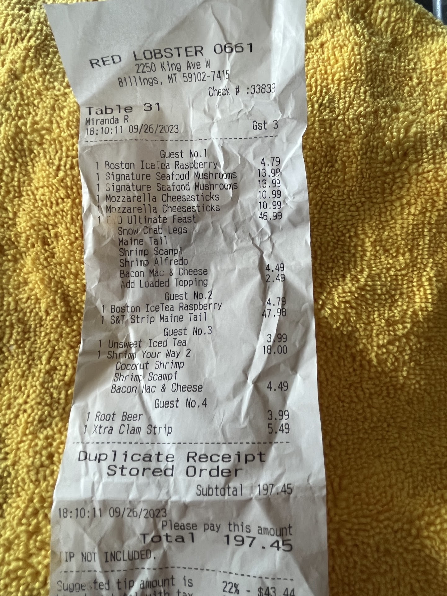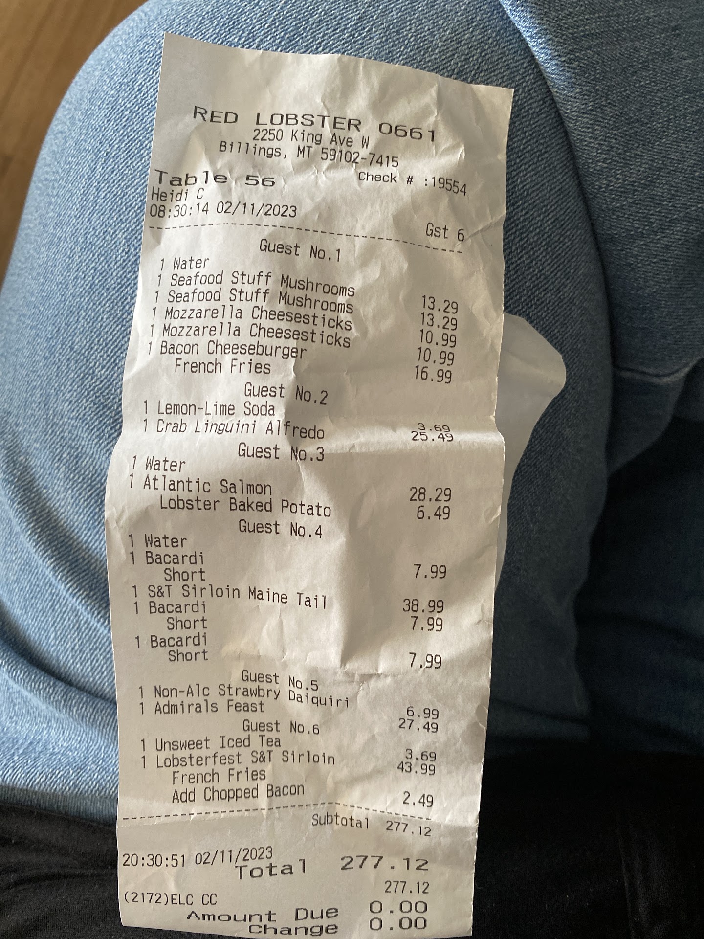 Read moreI’m sorry that there is not a zero as that would be our rating. We visited on 2/11/23. As we don’t live near a Red Lobster this was our unanimous choice amongst the six of us after a weekend of high school wrestling. The restaurant wasn’t very busy as there were many empty tables. It was a half hour wait to be seated which was fine if they had been busy. We ordered drinks….surprised they didn’t know what a BV ditch was and after all the drinks were served the waitress said they don’t have whiskey. Rum and coke it is. When the meal finally showed up an hour later, they had missed one of the dinners. The server said she’d look for it. When she returned with the plate she said it wasn’t on the tray but found it on the counter. I have NEVER been so disappointed in the quality of the food. The shrimp was nothing more than the frozen shrimp you buy at the store and were overcooked. The scallops were over cooked and smaller than a dime, some were just dough. All of the items were lukewarm. The $16.99 bacon cheeseburger was ordered medium and was as well done and dry as could be. The crab linguini alfredo was very greasy and this we showed to the server. The $28.29 salmon filet that was about 3” long was very dry. Lemon couldn’t bring it back. I saved two of the worst for last: a sirloin and a Maine tail. The “sirloin” was the size of a small dry hamburger patty and when cut, looked like a patty. The server said it was a sirloin…it was 1/2” thick and oddly round— our grandson had the same but his sirloin was about an inch thick and looked like a steak. The lobster was about 4” long and rubbery, room temperature and the butter was cold and gelling on top. Three of us never even received the baked potatoes that came with the dinner!! We didn’t even see the server again to mention it. They weren’t able to get Worcestershire sauce, the second rum and coke took forever to get and the third didn’t show up until we were paying the bill and asked why it was on the bill. They brought it to us while we were standing up to leave. The gal said “or are you wanting me to take it off the bill?” The total bill was $277.12!!!!!!! I wouldn’t complain about the cost for a good meal but really?? Our whole group was VERY...